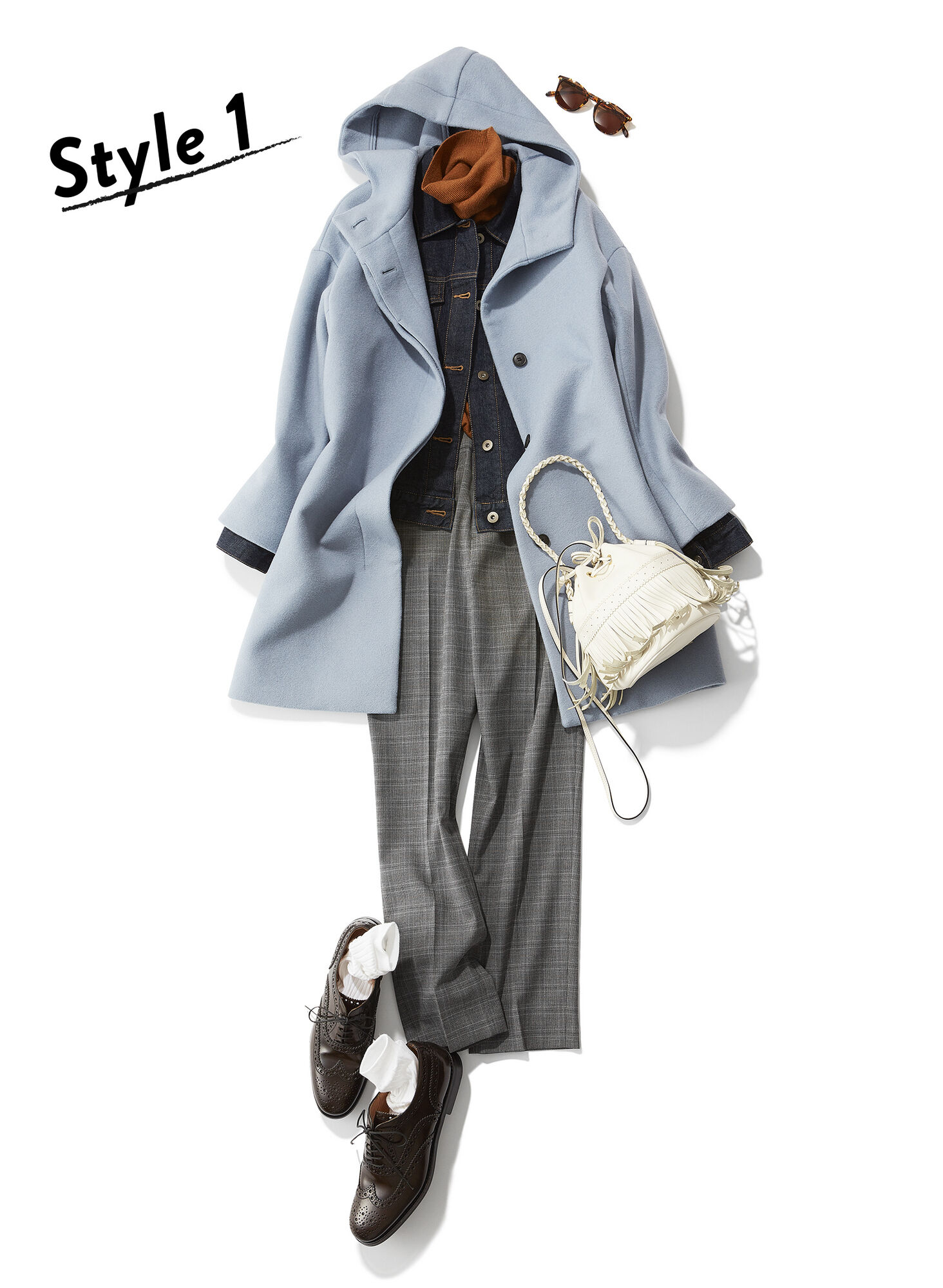 「ストレッチの効いたアンクルパンツは、座ったり立ったり動作の多い日にもらくチンで、きちんと見えもする便利アイテム。子連れのお出かけの日にも大活躍です。気の置けない友人の自宅なので、デニムジャケットを合わせてカジュアルに仕上げました。きれい色のアウターに、インナーはこっくりカラーのカシミヤタートルネックセーターを。色合わせでおしゃれを楽しみます」。