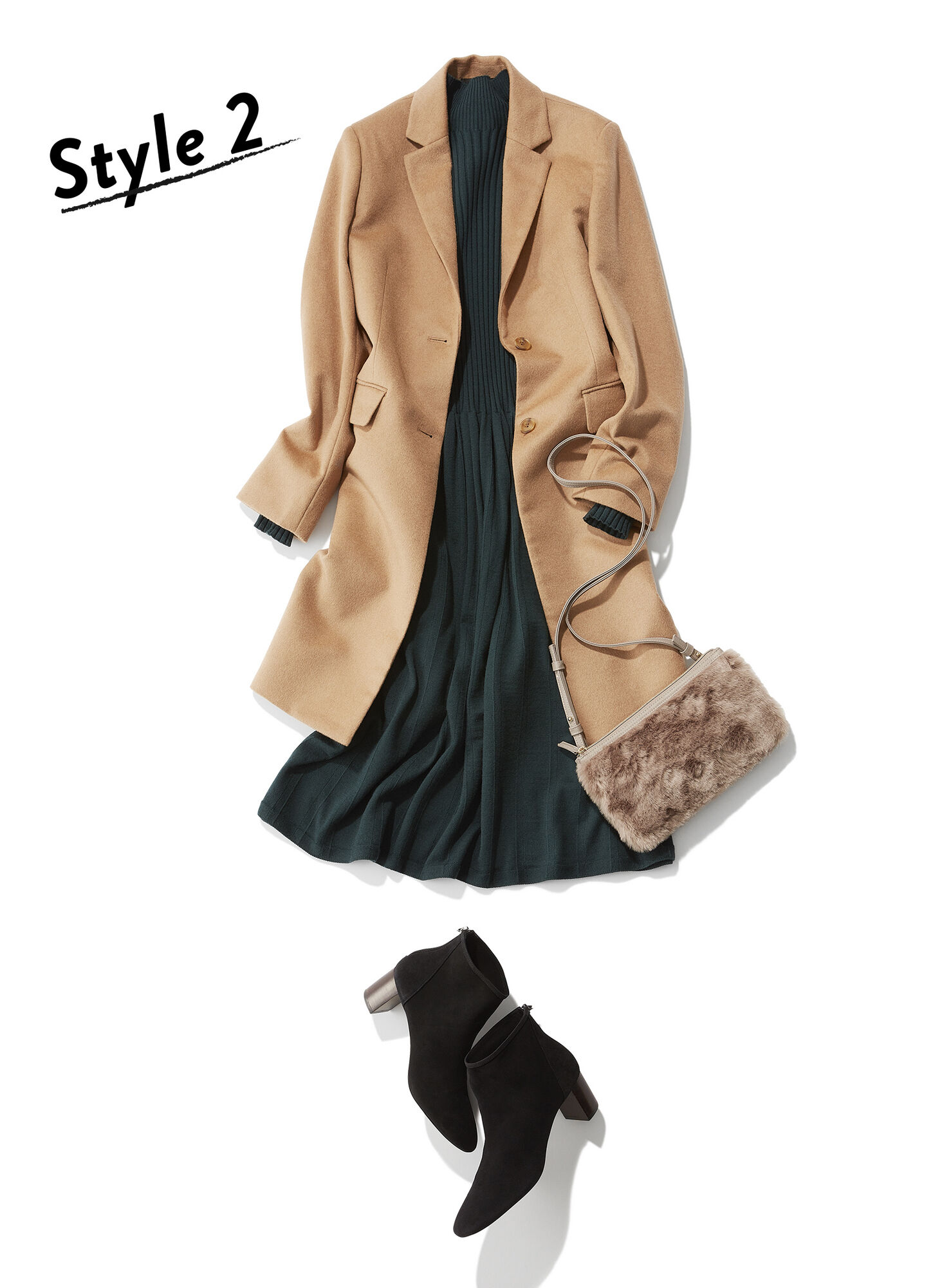 「子どもも小さく、なかなか外食ができないのですが、一年を締めくくる12月は、家族できちんとしたレストランでお食事に出かけるようにしています。そんな日は、やっぱり女性らしいワンピースで。シルエットが美しく、シンプルなのにふんわりと華やかなニットワンピースをチョイスします。端正なチェスターコートに、ファーバッグで今っぽさをプラスさせて」。
