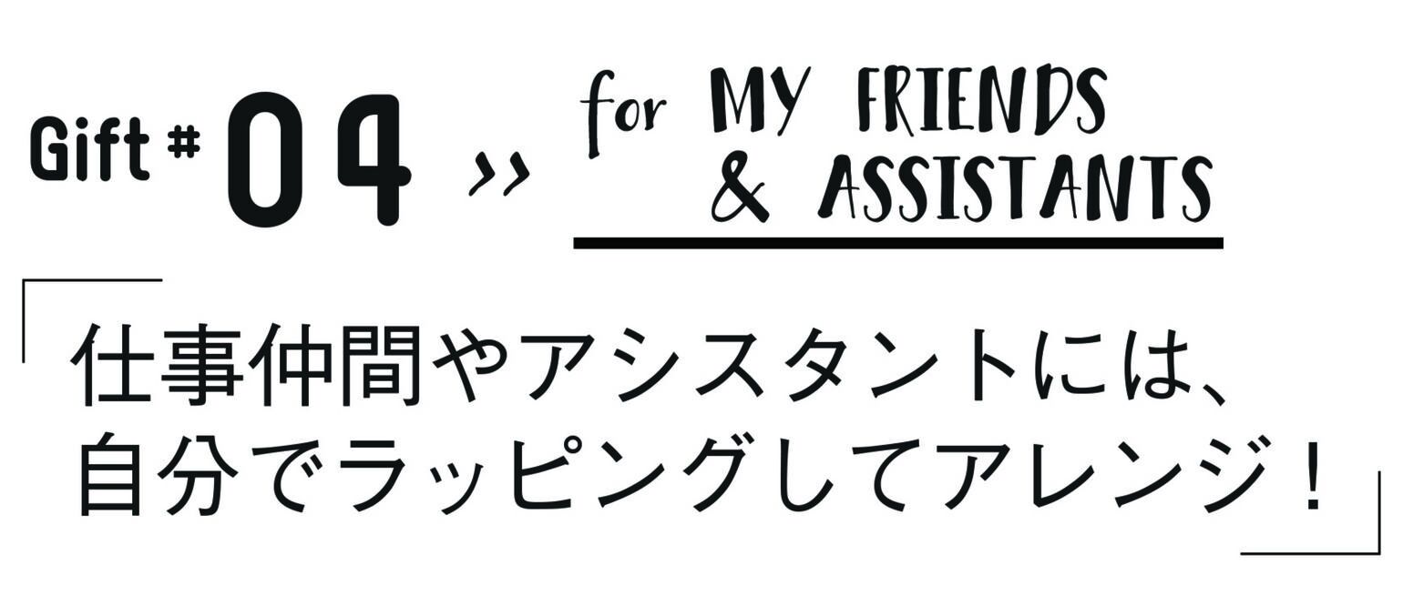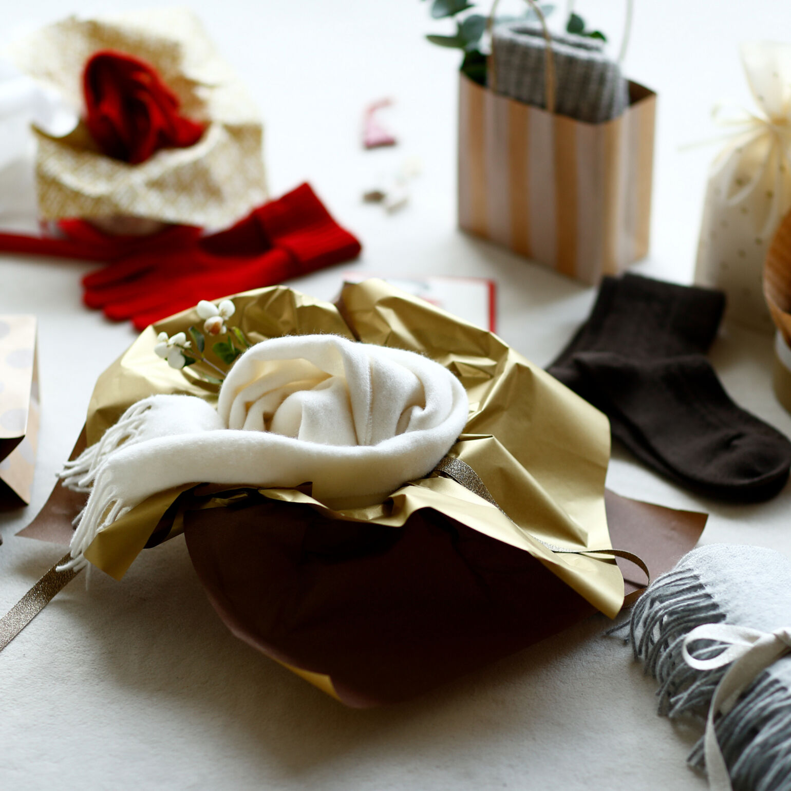 「いつもお世話になっているスタッフやアシスタントにも、一年の感謝の気持ちを込めて。マフラーや手袋、靴下などの冬小物をプレゼントします。気を遣わせないように、気軽に使えて、コスパの良いもの、そして、色柄の可愛いものを選んでみました。ありがとうのメッセージを添えて、一人ひとりの顔を思い浮かべながら、自分でラッピングするのも楽しみのひとつです。」