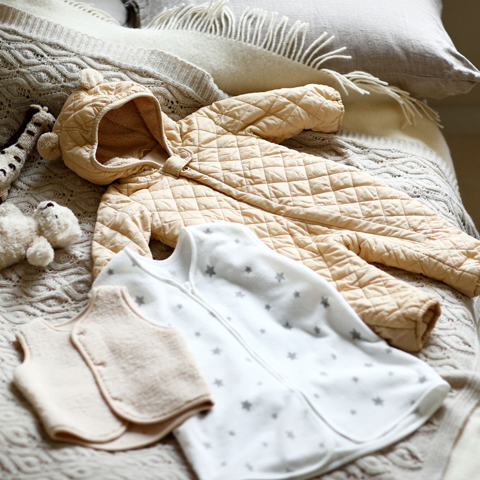 「赤ちゃんが産まれたばかりの友人のギフトには、冬にぴったりのオールインワンとスリーバー、そしてベストのふわもこセットを。防寒セットがあれば、お散歩がてら外に出るときも暖かくて安心です。ふわふわな素材感と、優しい雰囲気のカラーが素敵です。子ども服選びにも妥協ナシのおしゃれな友人も喜んでくれそう」。