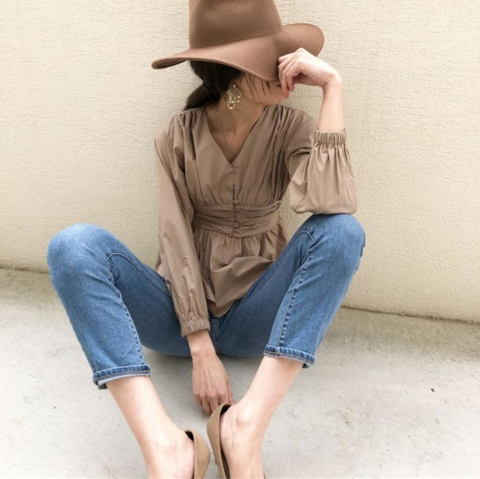 落ち着きがあり、やわらかな雰囲気を醸すスモーキーカラーにブルーのデニムが鮮やかさをプラス。コーデが地味になることも、ぼんやりすることもなく、互いを引き立て合っているように見えます。