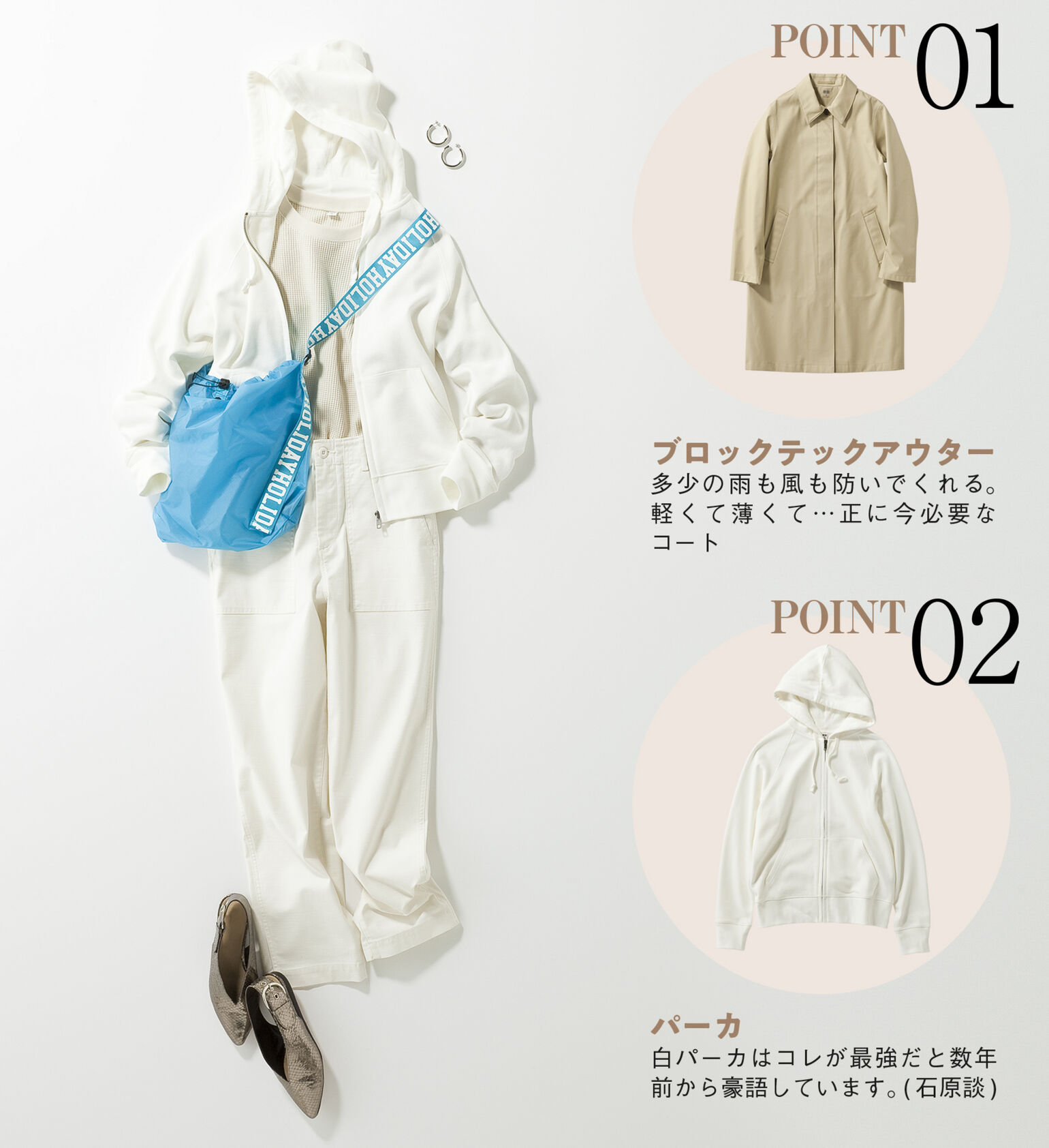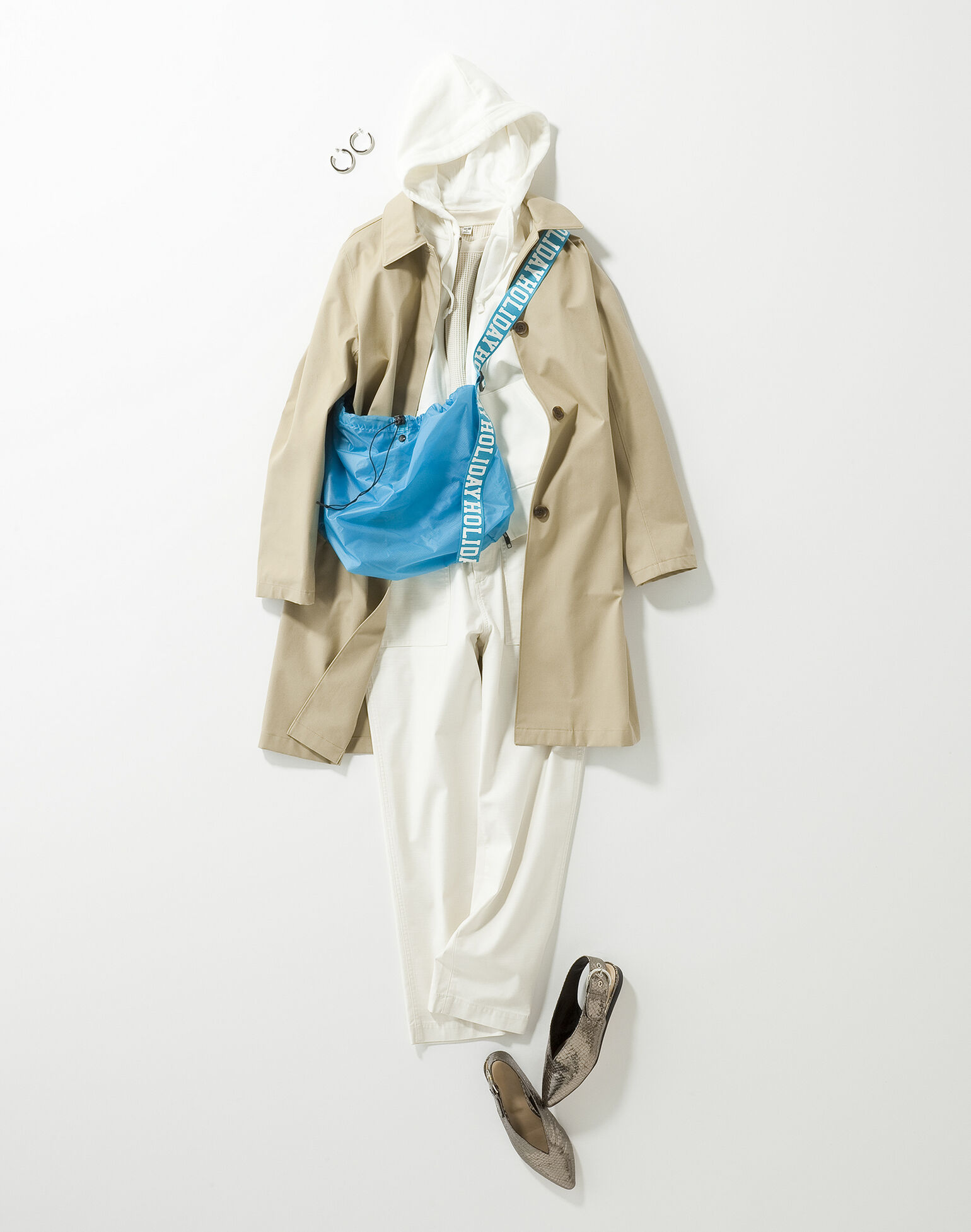 メンズっぽい雰囲気のブロックテックステンカラーコートに合わせたのはどちらもトレンドのワッフルTシャツとベイカーパンツ。さりげなく取り入れたトレンドアイテムでシンプルスタイルの鮮度が上がります。明るいベージュと白のコントラストが爽やか!