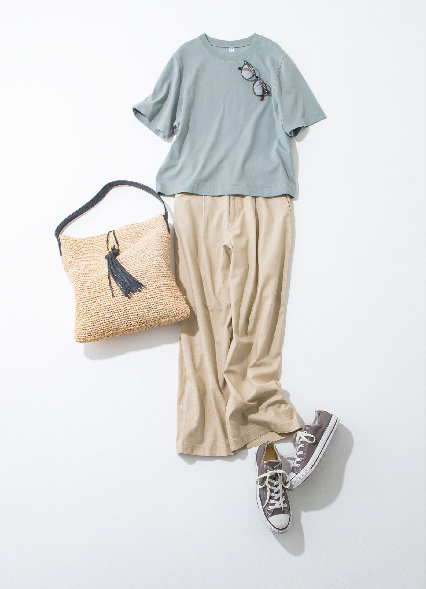 ゆったりTシャツにワイドパンツをさらっと合わせたボーイズライクなスタイル。ペールミントとライトベージュのニュアンスある配色でまとめたら、さらに抜け感がアップします。