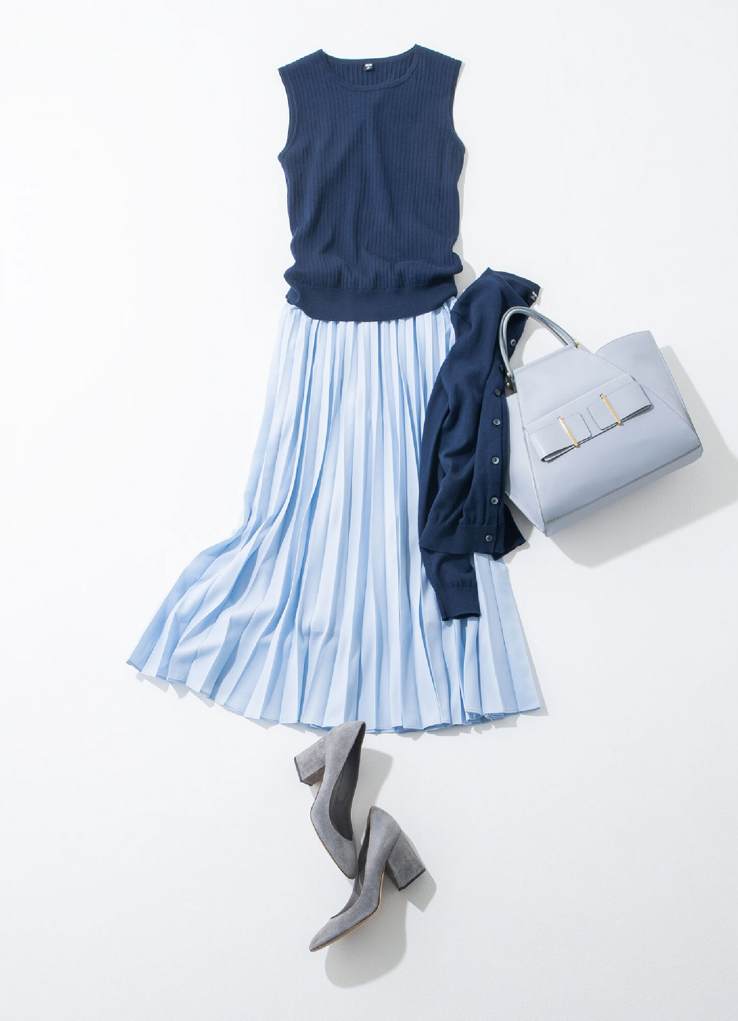 夏でもきちんと感が漂う、プリーツスカートとアンサンブルニットの組み合わせ。ペールブルーとネイビーのグラデーションでまとめれば、タイムレスな上品さが引き立ちます。