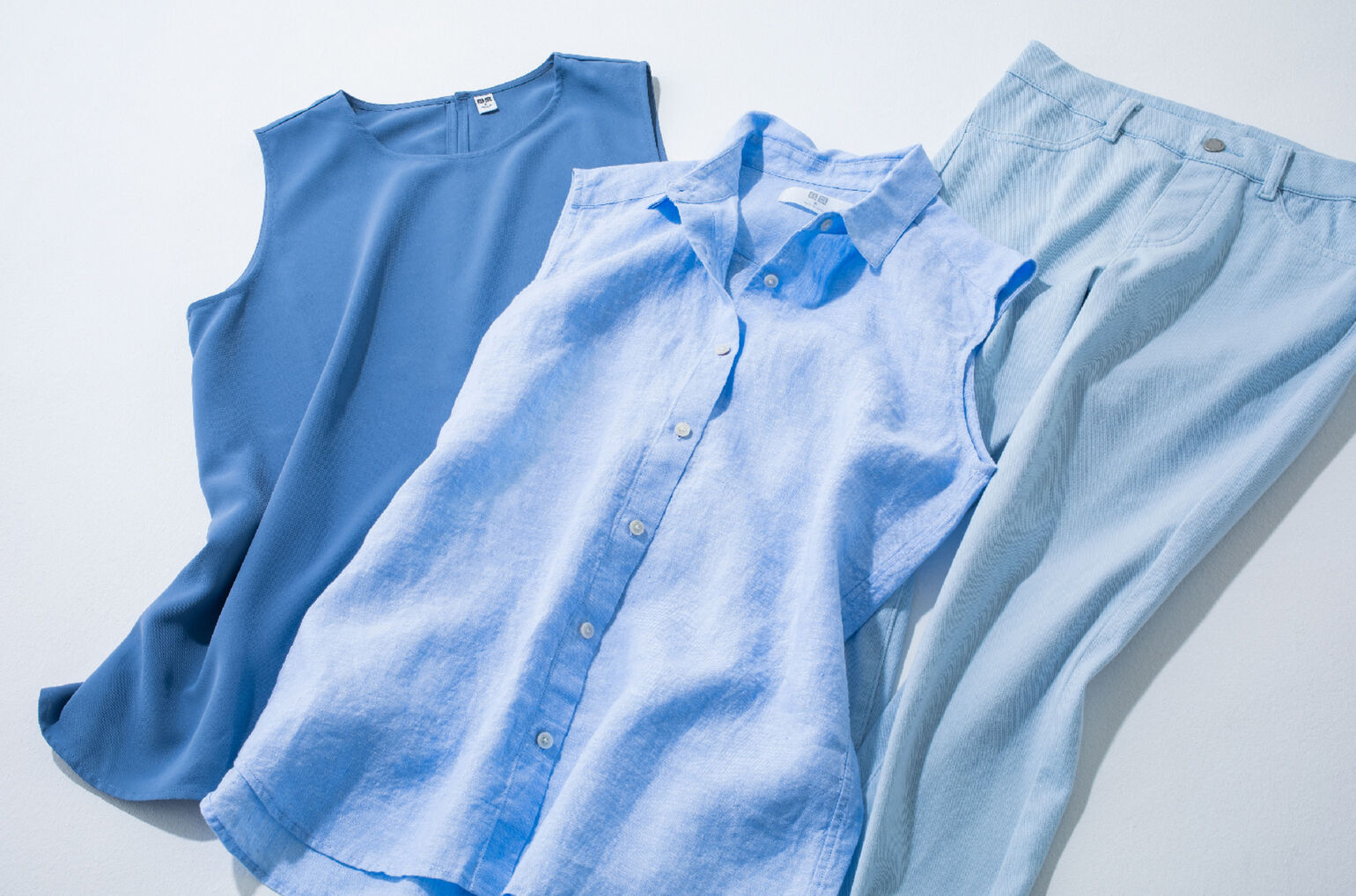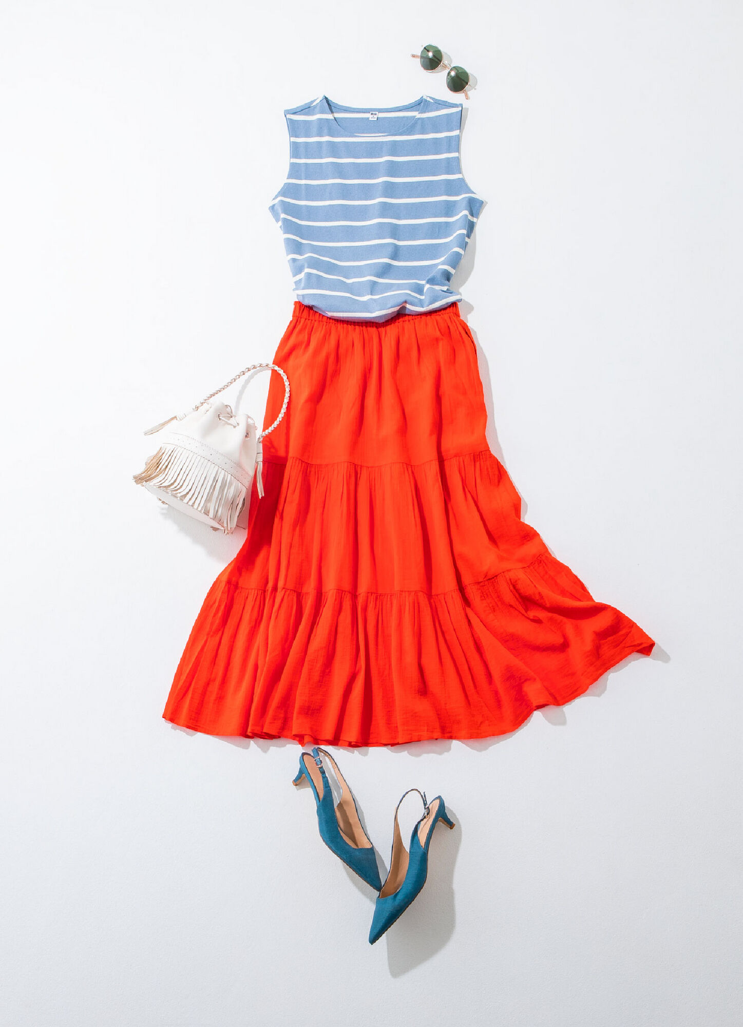 グレイッシュなベールブルーとビタミンカラーの表情豊かなコンビで、夏らしさをアピール!あえてボトムスにインパクトカラーを選ぶのも、今年らしさUPの秘訣です。