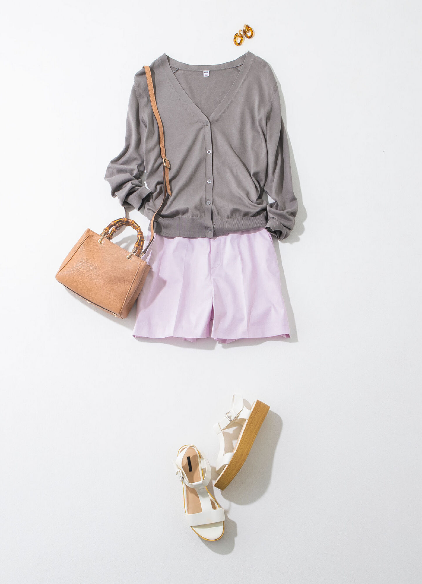 セーター感覚で着たV開きカーデ×ショーパンの休日ムードなカジュアルコーデ。チャコールグレーとペールピンクの絶妙な色合わせでまとめれば、ぐっとスタイリッシュな雰囲気に仕上がります。