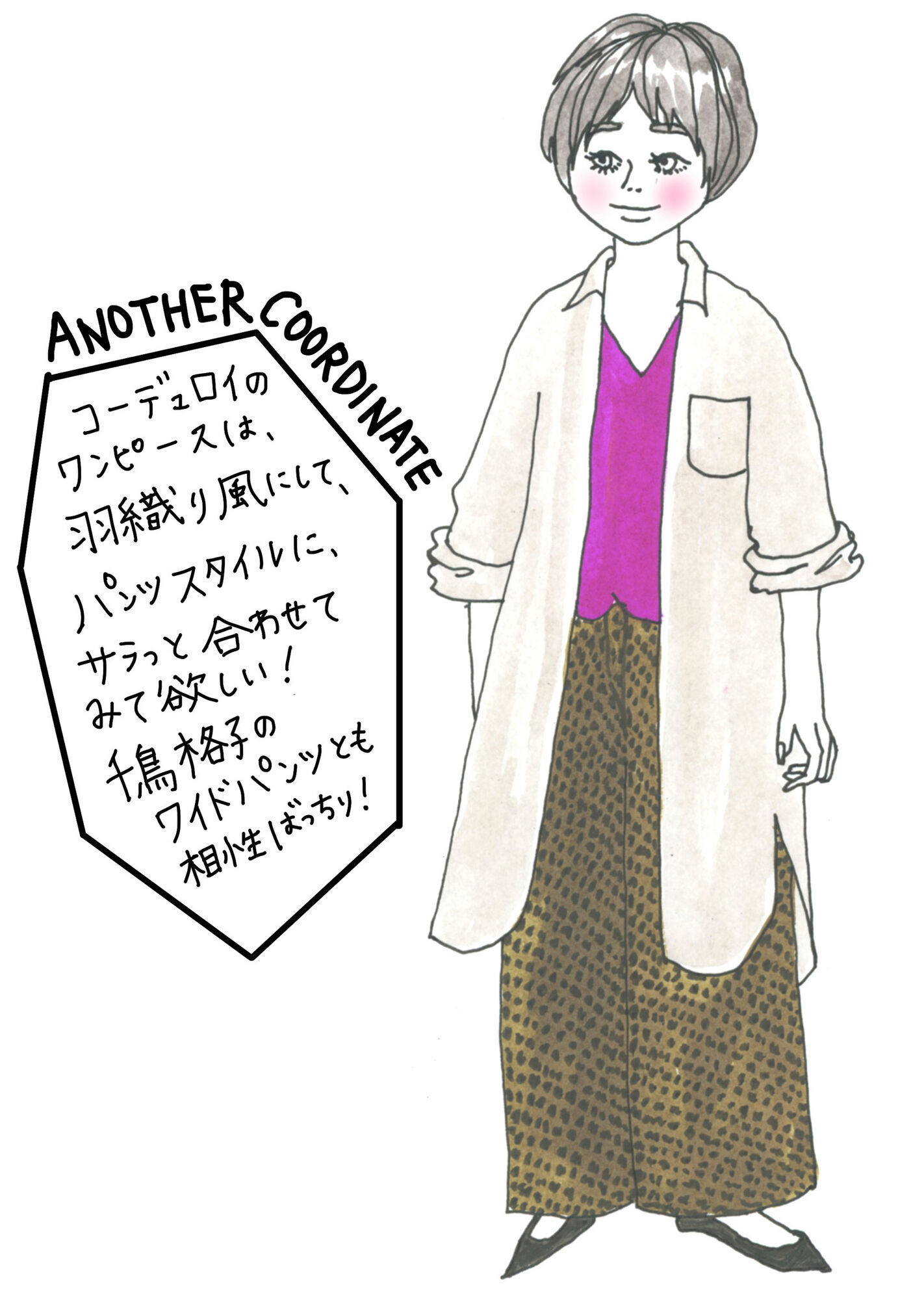 「コーデュロイのワンピースは、羽織り風にして、パンツスタイルにサラッと合わせてみて欲しい!千鳥格子のワイドパンツとも相性ばっちり!」