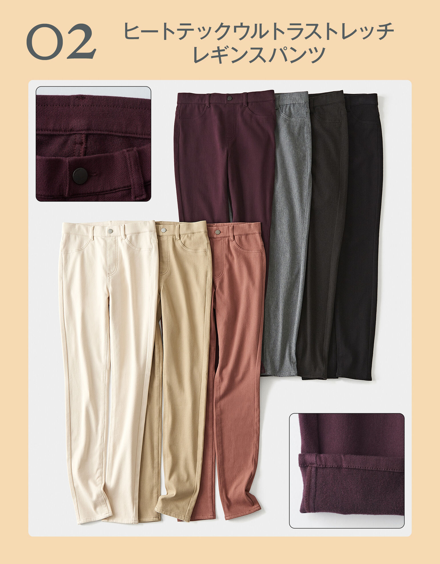 「細身のパンツ感覚ではけるレギンスは、裏起毛があたたかく、寒い時期には朝はいたときにヒヤッとしないのがうれしいポイントです。自在に伸縮するウルトラストレッチ素材にアップデートされ、動きやすさと防寒性を兼ね備えました。真冬には、この上にさらにパンツを重ねて防寒することも。」