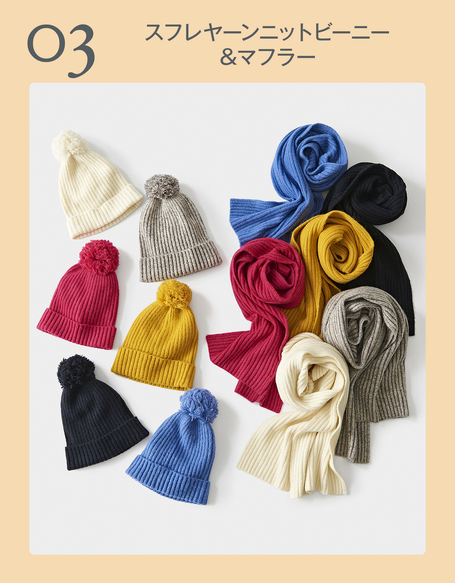 「今年発売されたばかりの新素材、スフレヤーン。ニット特有のチクチク感がなく、軽くてソフトな肌触りが特徴です。全6色とカラバリが豊富で、イエローやピンクなど遊び心のある色味もおすすめ。同素材のニット帽&マフラーをセットで使って、おしゃれに冬を楽しんでください」