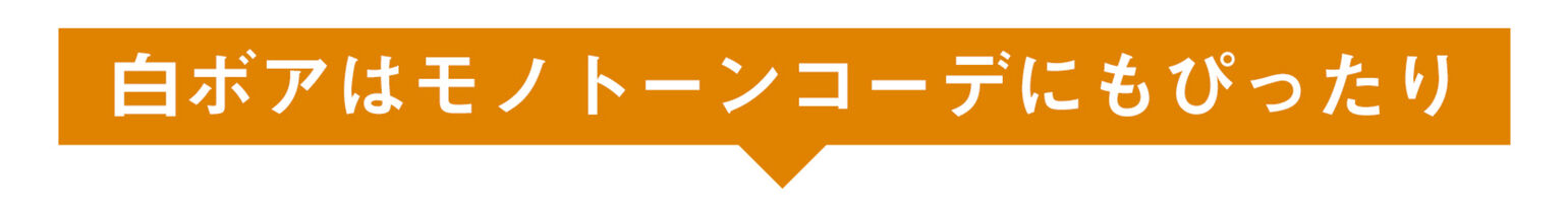 キルティングとボア、2通りの着こなしが楽しめるリバーシブルデザイン。もこもこの白いボアを表にして羽織れば、上品なモノトーンコーデに季節感のある華やかさが生まれます。さらに、裏地のキルティング部分のピンクが絶妙なアクセントとして効いています!