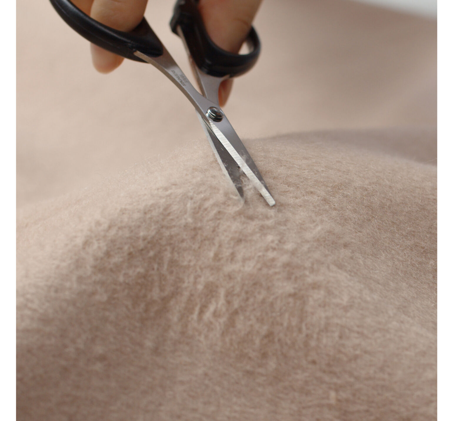 つまんで引っ張ると生地を傷めるので、必ず道具を使います。刃先の細いはさみがおすすめです。毛玉がついた箇所を平らに置き、生地を切らないように優しく切り取ります。