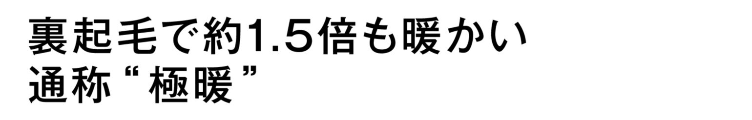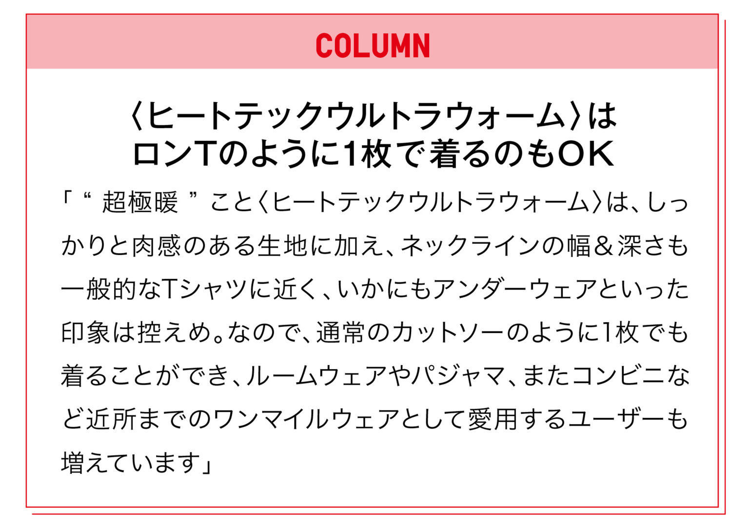 「“極暖”こと〈ヒートテックエクストラウォーム〉は、暖かな空気をより多く蓄えるよう、特殊な編み立てで繊維のふくらみを高め、いっそうの保温力が実現されています。また天竺編みの通常の〈ヒートテック〉とは違い、こちらは裏面が微起毛になっており、そこにも暖かな空気を抱き込むうえ、肌触りそのものも暖かい。冷え込みの厳しい日、寒空の下に長時間とどまるようなシーンにオススメです」