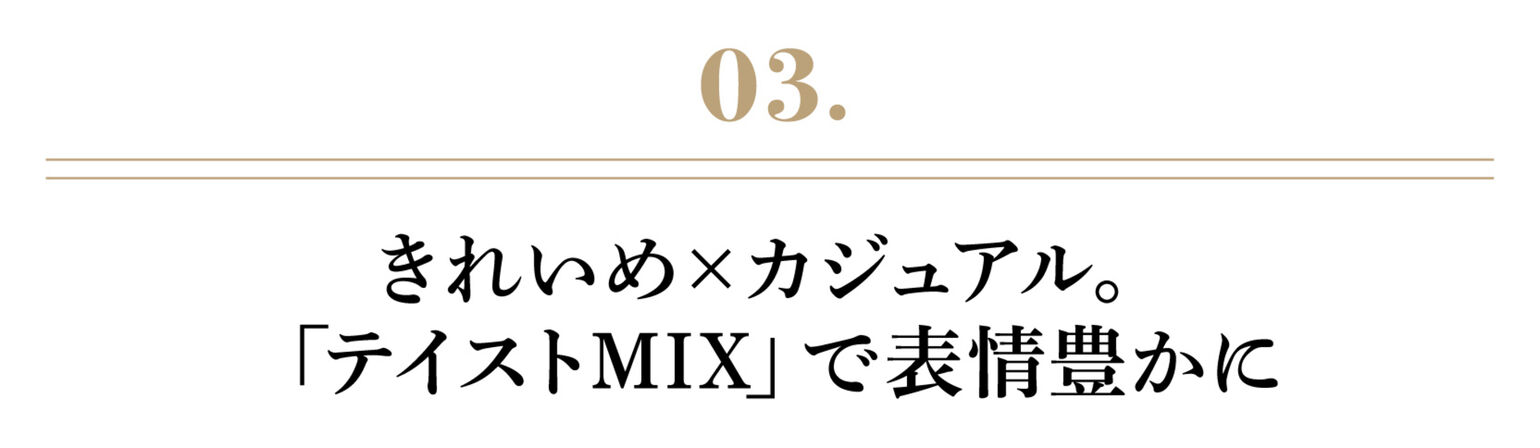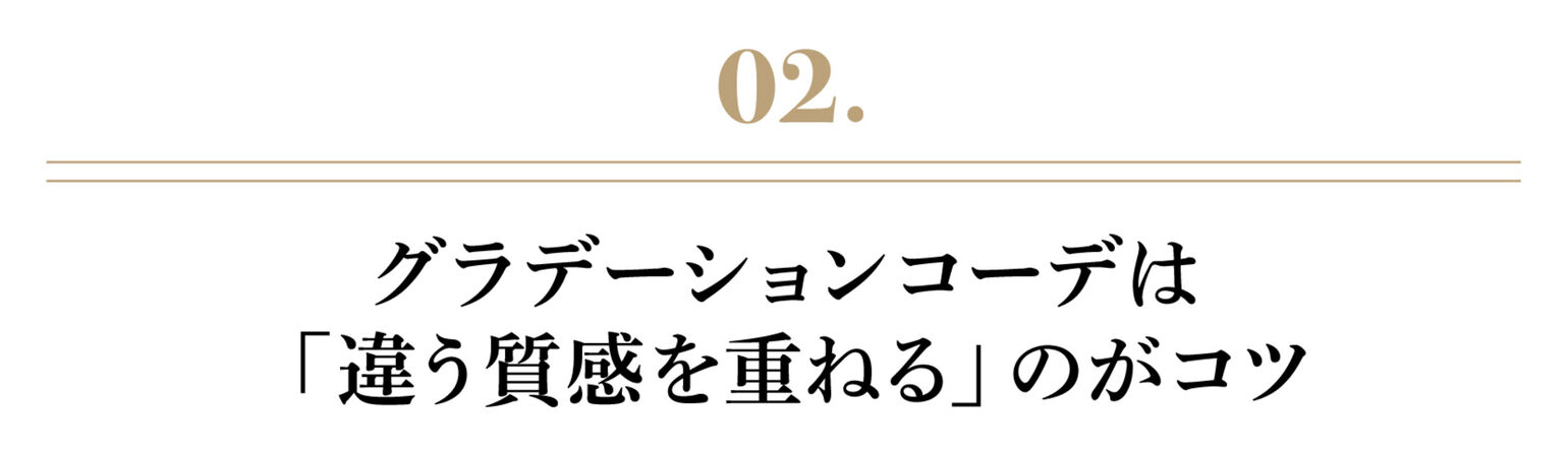 「ワントーンコーデで大事なのが“メリハリ作り”です。素材感で意識してもいいし、色の濃淡で作ることもできます。もう一つテクニックとして覚えておきたいのが、テイストでメリハリを作る方法です。例えば、きれいめのパンツとカジュアルなパーカー組み合わせのように、真逆なものをMIXするとコントラストが簡単にできます。抜け感にもなってワントーンを印象的に見せてくれます」