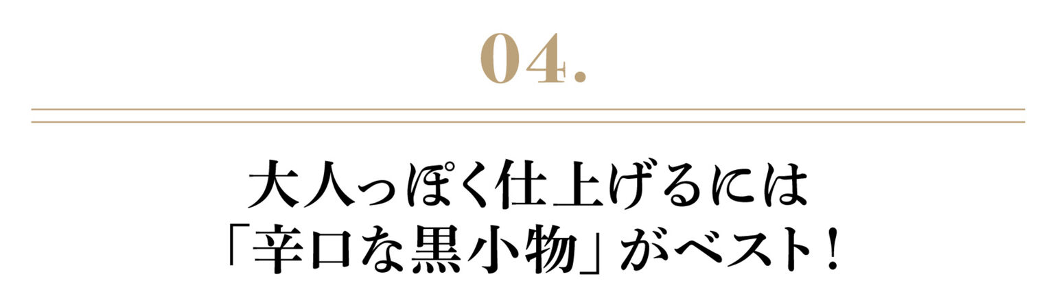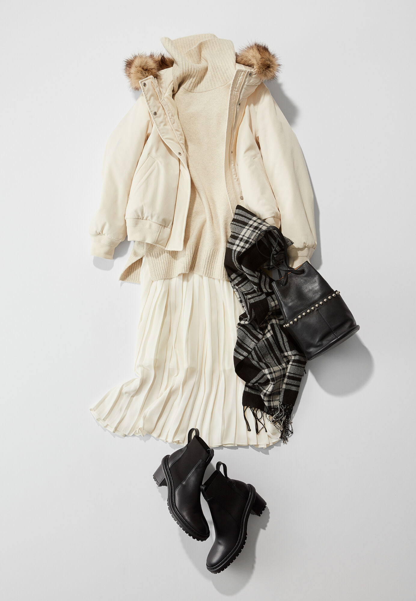 「エクリュなトーンはどんな小物でも合わせやすいですが、タートルニットにプリーツスカートのように甘めにまとめたときは、辛口な黒小物が正解。全体を引き締めて大人っぽくシフトしてくれます。チェックストールなど柄物をひとつプラスすると、華やかなムードになるのでおすすめです」