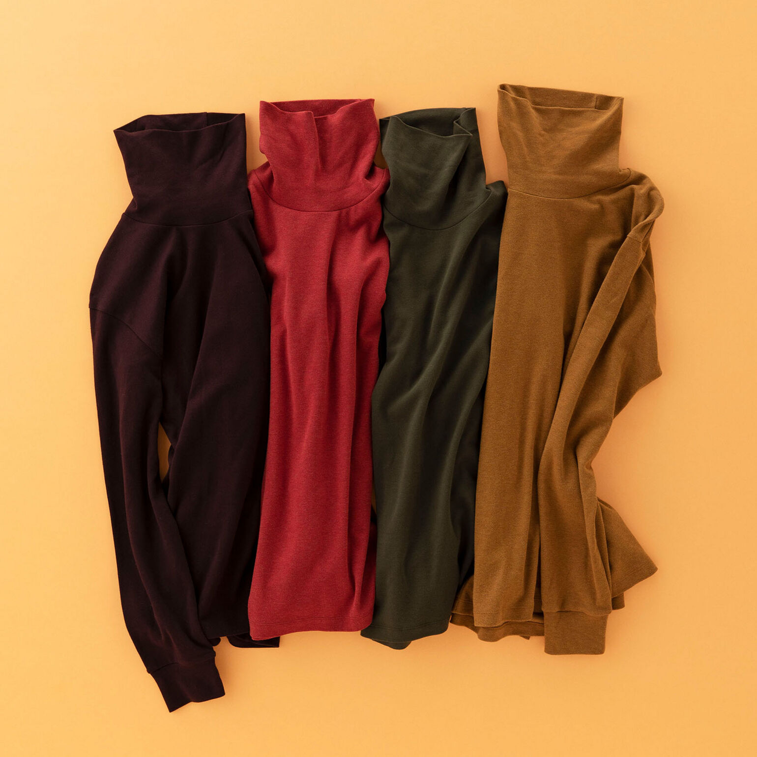 「首元の締め付け感が苦手で、なかなか理想のタートルネックに出合えなかったのですが、ついに今年思わず2色買いしたのが、メンズのソフトタッチタートルネックT。冬場のレイヤード用にブラックのSサイズと、ちょっと大きめにデニムと合わせたいワイン色のMサイズを購入しました。コットン100%素材に起毛感がプラスされた柔らかな肌触りに、ぴたっとしすぎないシルエットが個人的に大ヒット。タートル部分は折り返さずに伸ばしてクシュっとさせて着るのがおすすめです」