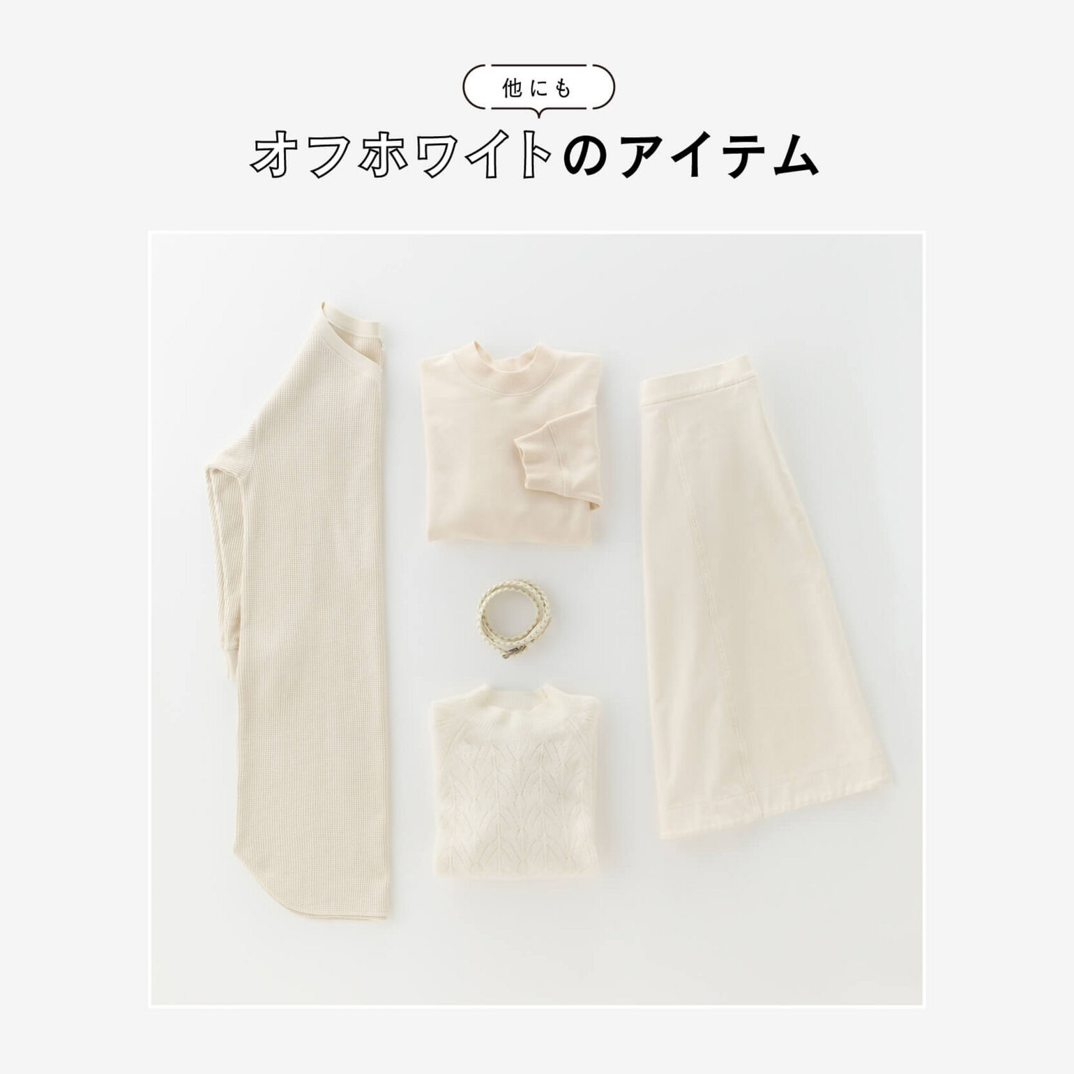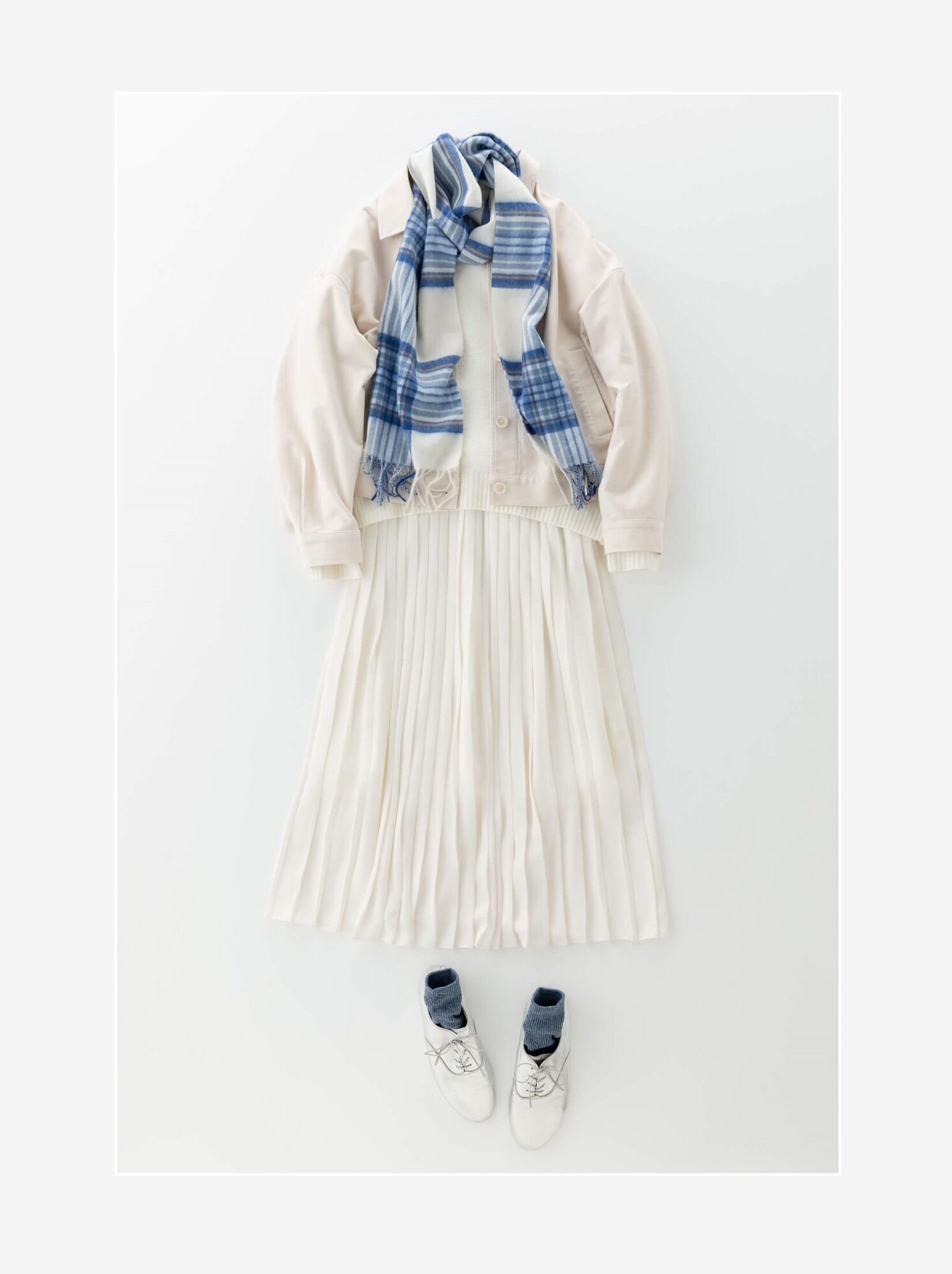 清潔感と透明感を与えられる、オフホワイトのワントーンコーデ。リラックス感のあるニットやジャージー素材のジャケットを重ねると、やわらかな雰囲気も演出できます。マフラーや靴下などに、刺し色の青を加えて全体の印象を引き締めると、おしゃれ感がよりアップ。