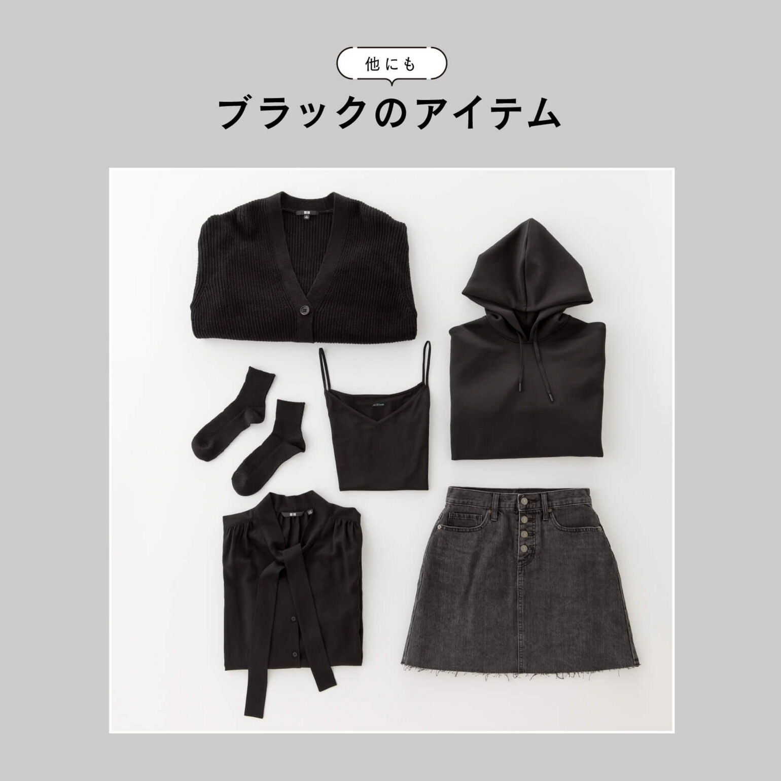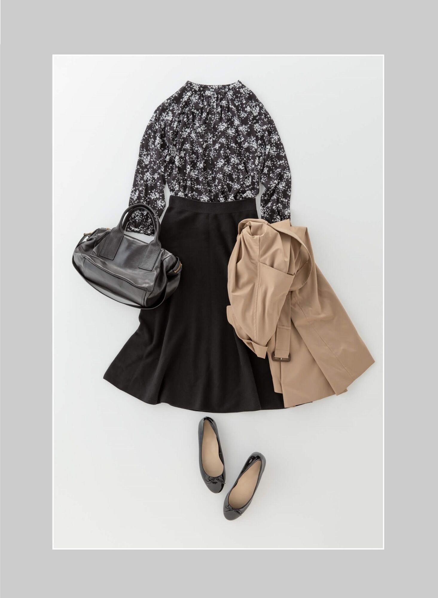 重めの印象になりがちなブラックを軸にしたコーデには、柄や素材選びがポイントに。トップスに白が入った花柄の柔らかいブラウスを選ぶと、大人な可憐さが加わります。フレアのスカートを合わせて、落ち着きの中にもかわいさのある佇まいを演出して。