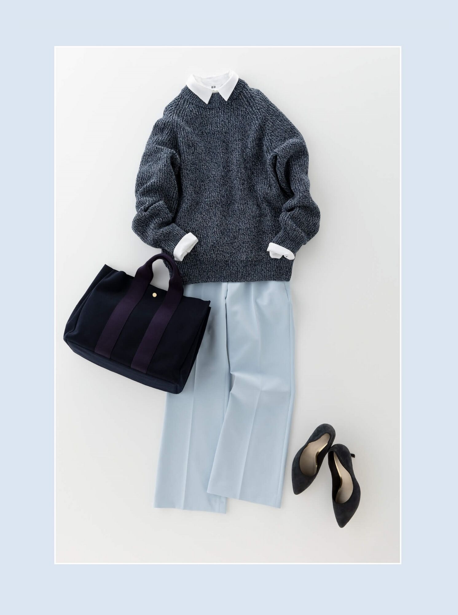 トップスにはあえてメンズサイズのニットをセレクト。オーバーサイズで、運気アップとともに今年っぽさも狙いましょう。中に重ねた白シャツや、センタープレスのパンツで、キレイめな印象にまとめて。