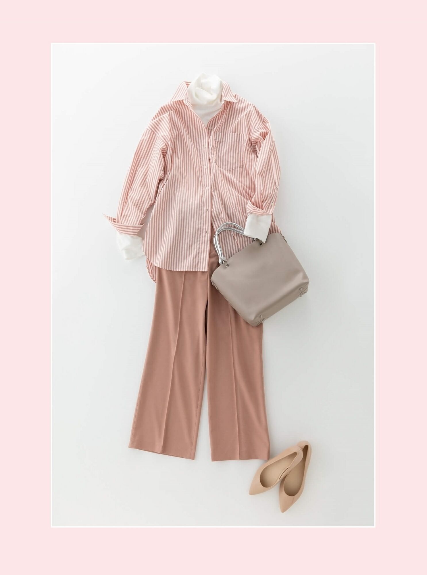 上下ピンクのコーデは甘くなり過ぎないよう、パンツ×シャツでマニッシュ感を出すと○。シャツにタートルネックTをインすると、こなれ感も演出できます。足元はパンプスで大人っぽさをプラスして。