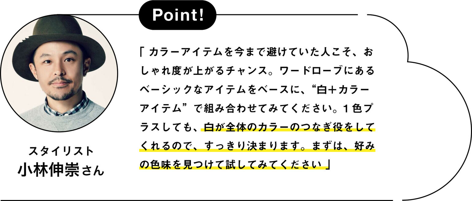 春の訪れを徐々に感じはじめる今日この頃、ファッションでも季節のムードを取り入れたいと思う方もいるでしょう。発色のよいアイテムを一点取り入れるだけで、気分も一新するはず。着こなしのキーワードは、「白」と「同系色」そして「3色以内」という3つ。雑誌や広告で活躍中のスタイリスト小林伸崇さんが、春のカラーコーディネート術を教えてくれました。