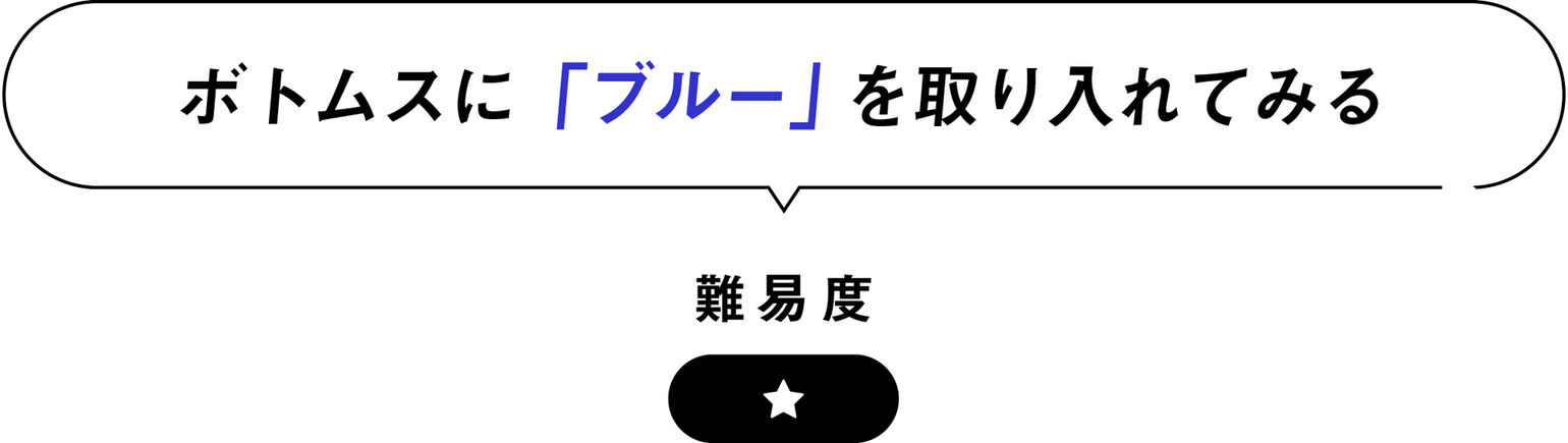 「デニムなどで馴染みのあるブルーは、色づかいを意識することなく取り入れられる色のひとつ。普段の着こなしをアップデートするなら、鉄板なのは、同系色のコーディネート。ブルーのビーニー(ニットキャップ)に、スリムフィットのコットンパンツを合わせれば、大人のカジュアルが完成。白のクルーネックセーターで“抜け”感の演出も忘れずに」