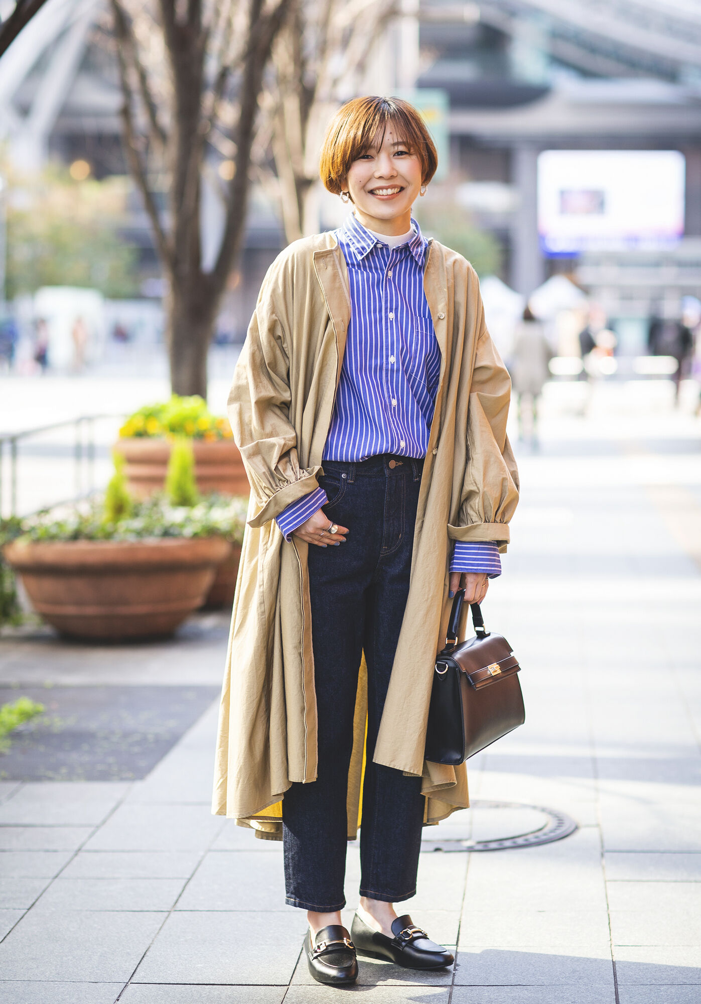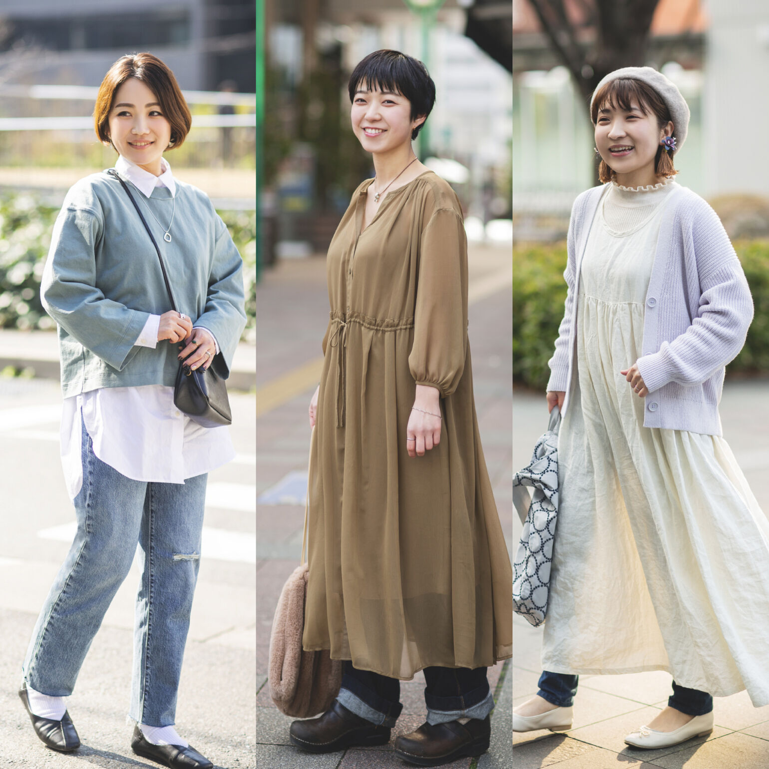 <左>『背が低いので短めトップスがお気に入り』レイヤードしたカットソーは脚長効果も大!<中>ライトトーンでまとめた春らしいスタイル。差し色の白が効果的。コートの袖のリールアップのぬけ感もとても印象的。<右>シンプルな1、2コーデもトレンドシルエットのパンツで一気に旬顔に。
