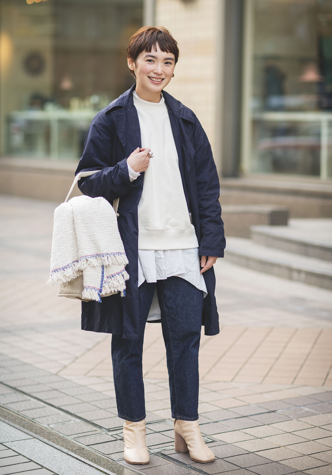 <中>ライトトーンでまとめた春らしいスタイル。差し色の白が効果的。コートの袖のリールアップのぬけ感もとても印象的。