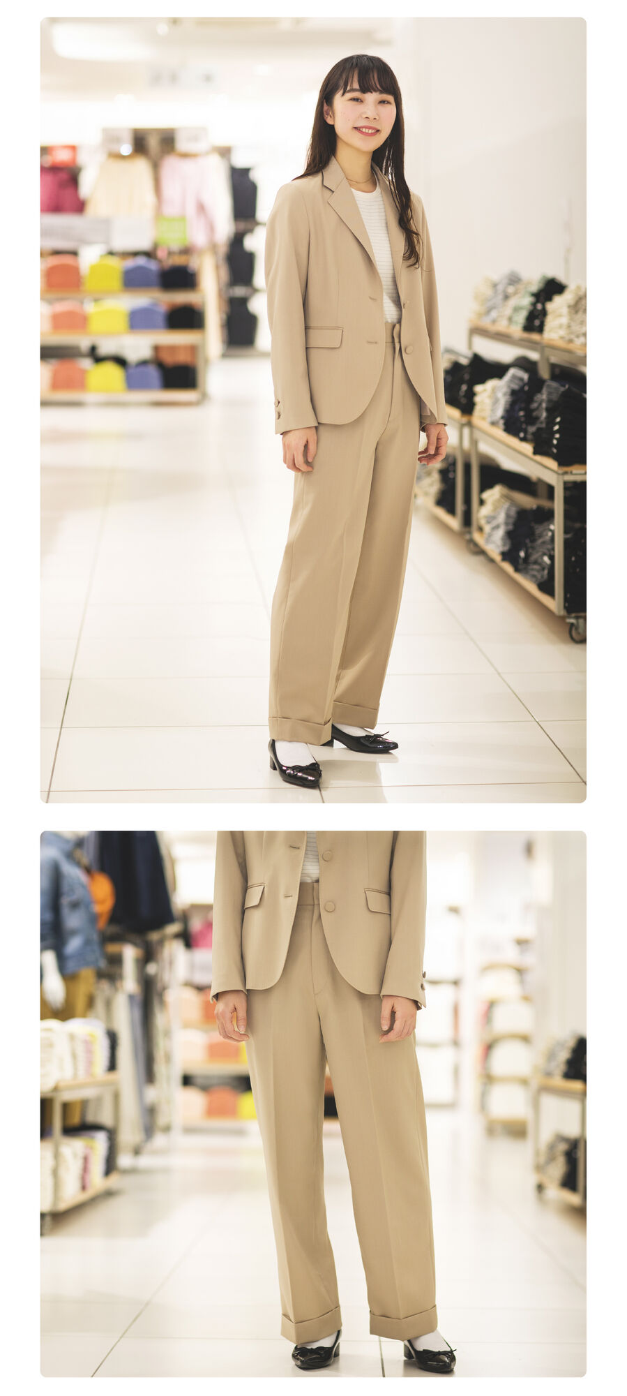セットアップでは珍しいワイドパンツのイネスのジャケット&パンツ。『ベージュのワントーンコーデは春も人気継続です。パンツは裾がダブルになっていてボリューミー、ウエストも高めなのでトレンド感が高いですね。単品使いもできて着回し力抜群のスーツです。』マニッシュなスーツをバレエシューズで上品に。ソックス合わせも今っぽくて素敵です!