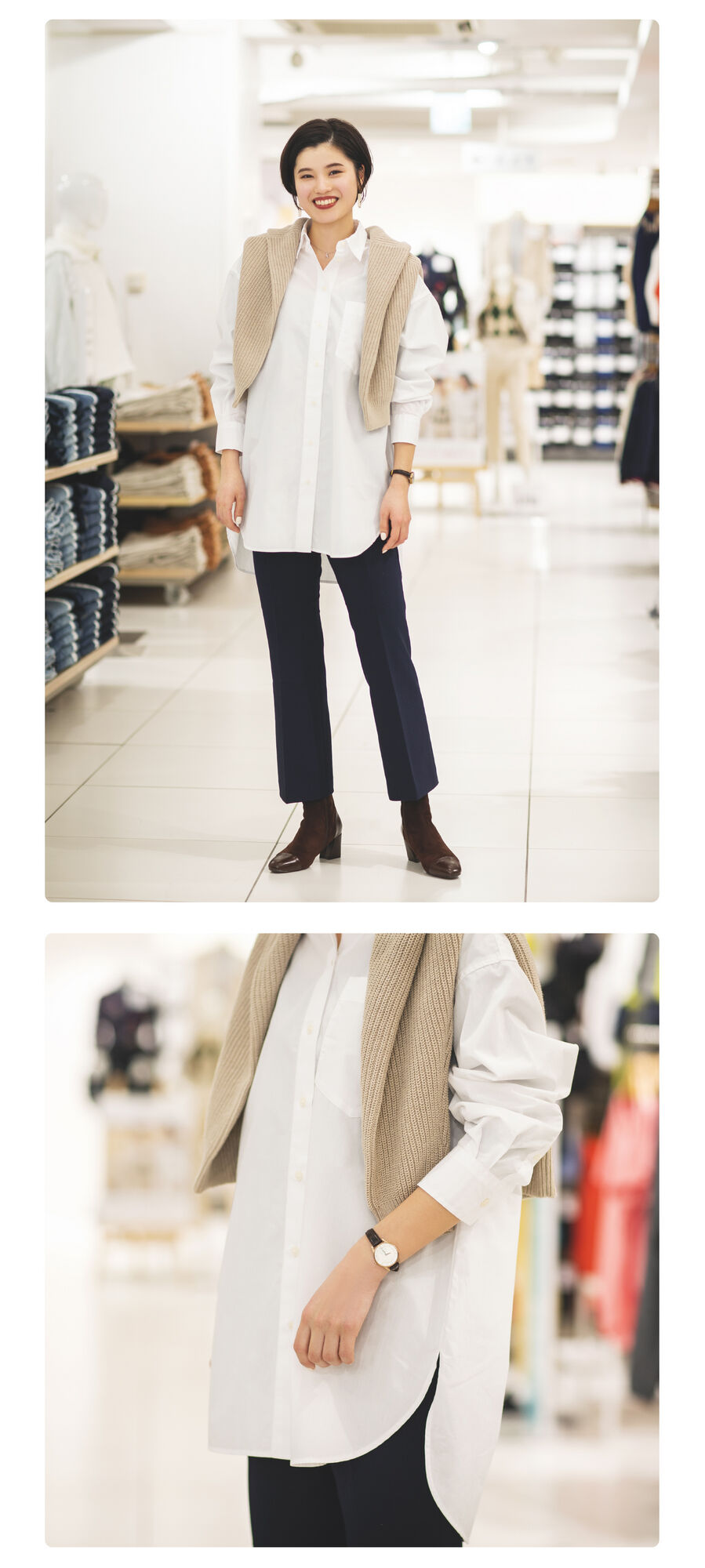『人気のロングシャツにややフレアシルエットのアンクルパンツを合わせました。』一見さらりとナチュラルに見えますが、ブーツとの合わせがかなりの上級者!濃いめの色でつないでいるのでブツ切り感が無く、より脚長に!ストールがわりにアクセントにしたベージュのニットも目線を上に上げる効果があるので丈の長めのトップスとの相性がいいです。メインとなるシャツを引き立てるテクニックが随所に散りばめられています!