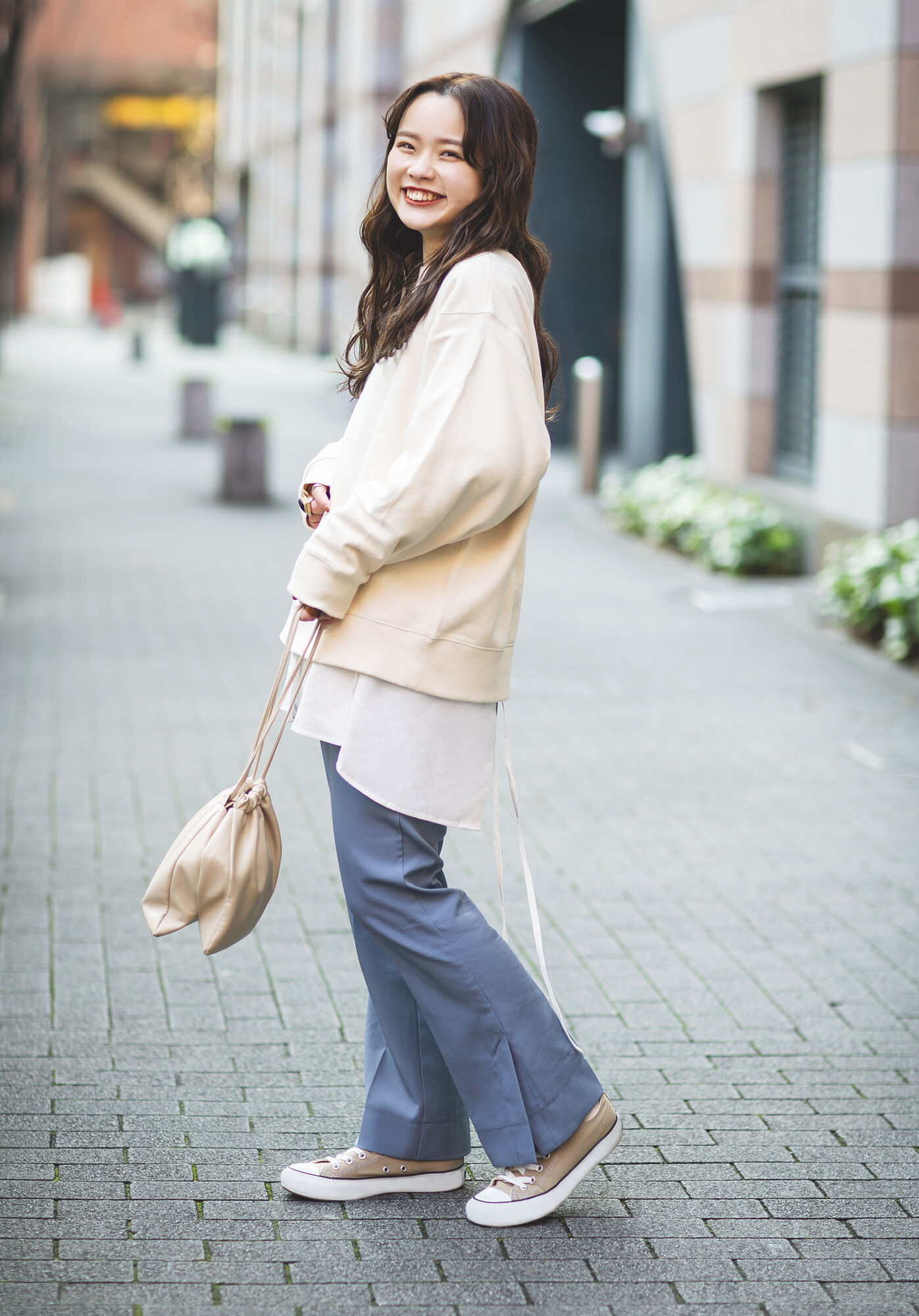 156センチの小柄な彼女が選んだスウェットはなんとメンズのXLサイズ!たっぷりとしたボリューム感が欲しかったので一番大きいものを選んだそう。重ねたシャツとフレアパンツも今年っぽくて正に旬のスタイル!全体的にくすみカラーでまとめてリラックスムードが素敵です!サイズ選びで見え方が変わってくるお手本コーデですね。