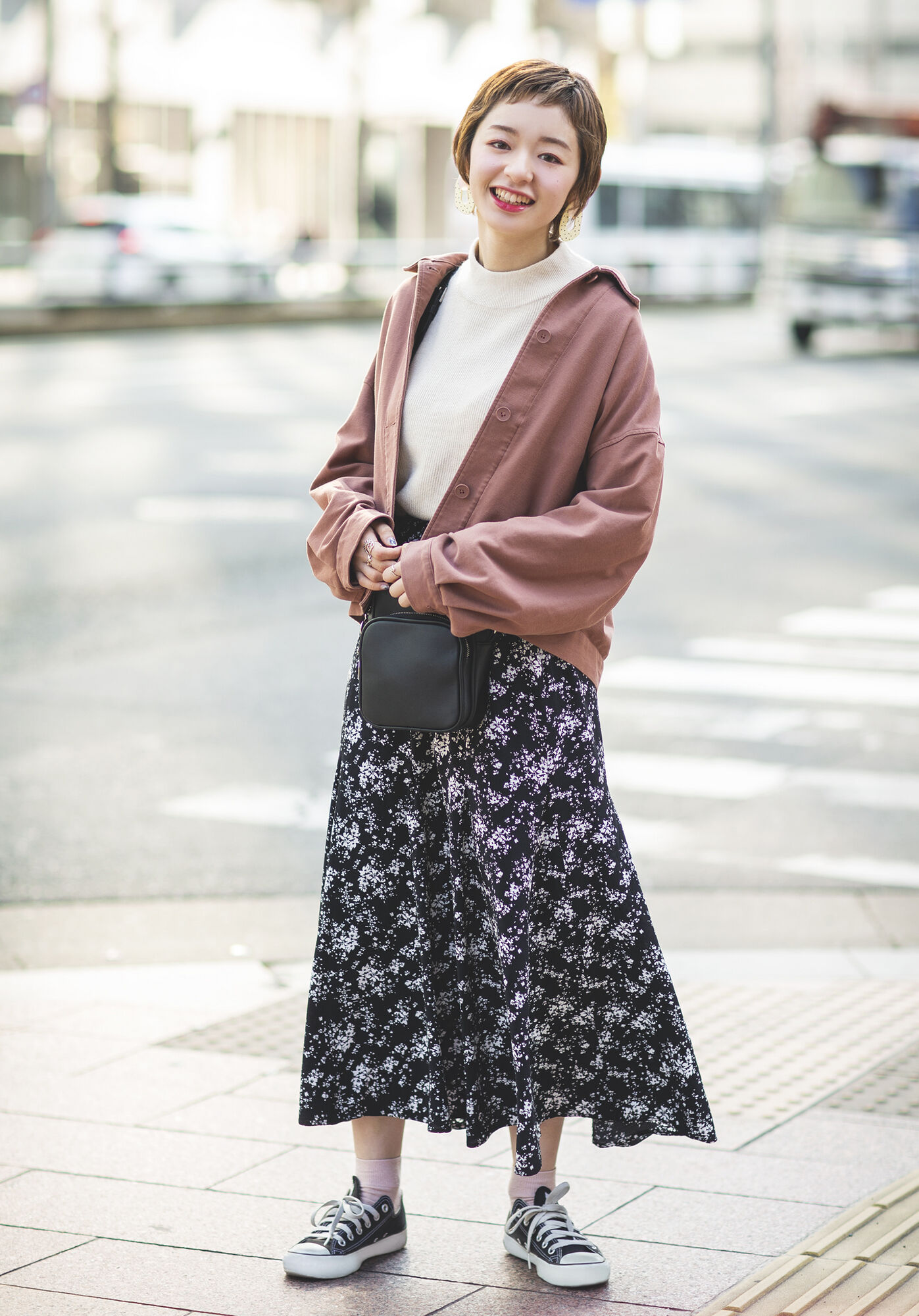 いまだ衰えを知らないくすみカラー旋風!ヴィンテージライクな色とシルエットが今っぽいピンクのジャケット。ビッグシルエットを着崩してこなれた印象です。ハリのあるジャケットと柔らかく揺れるフラワープリントスカートの合わせはすぐにマネしたくなりますね!ソックスもピンクで色を合わせているところも見逃せないポイントです。