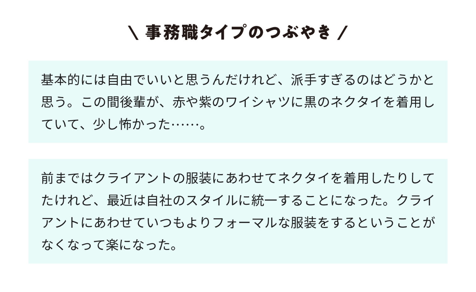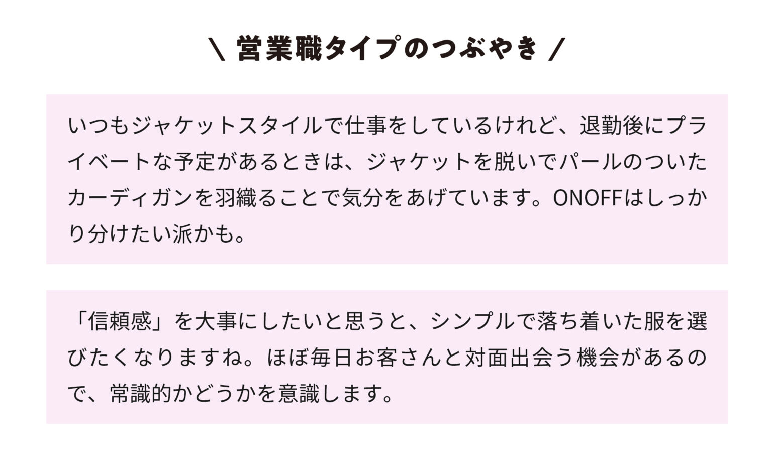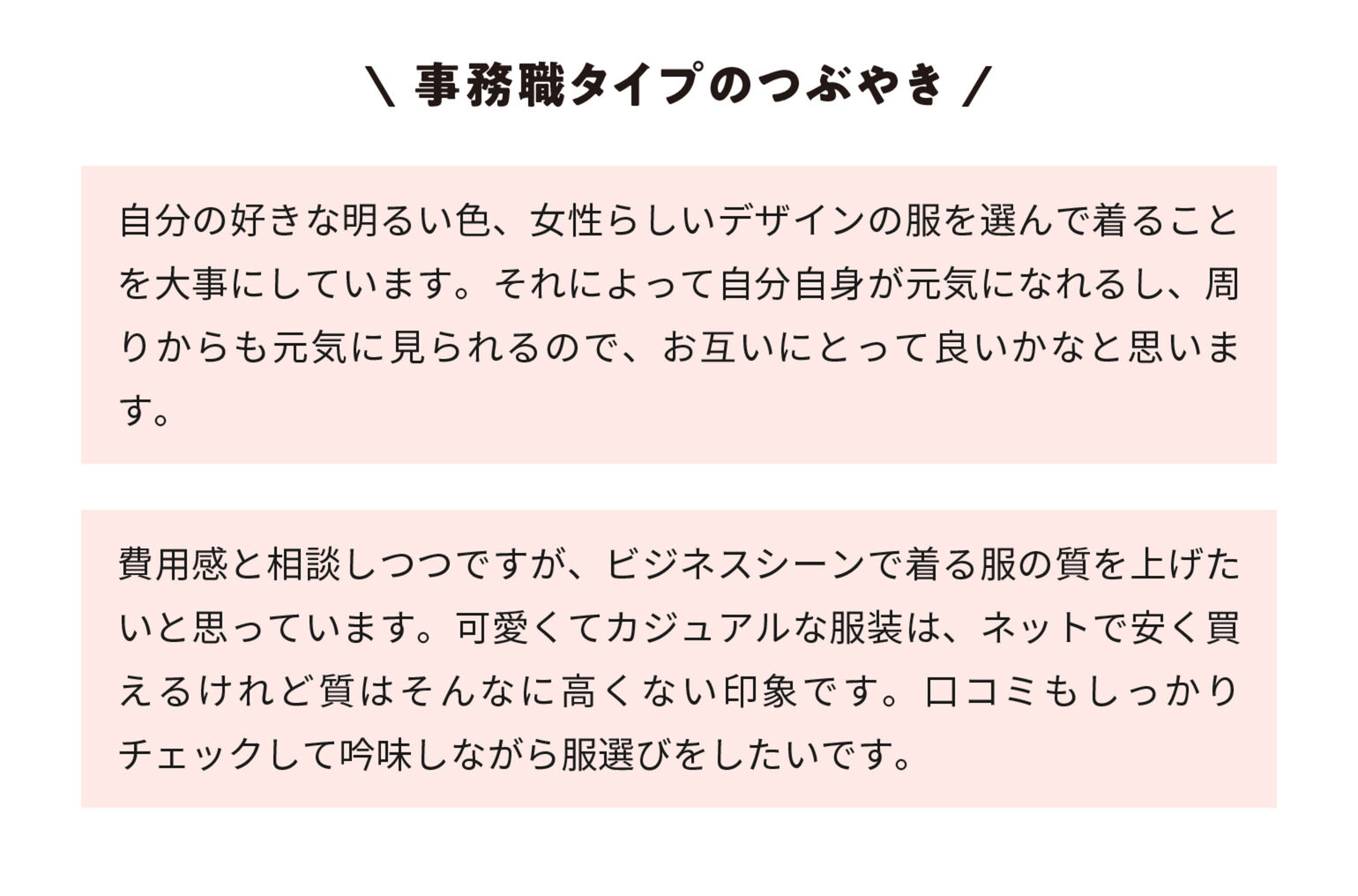 フォーマルさを保ちつつ、自分の好みやデザイン性を重視してビジネスウェアを選ぶ「事務職タイプ」。