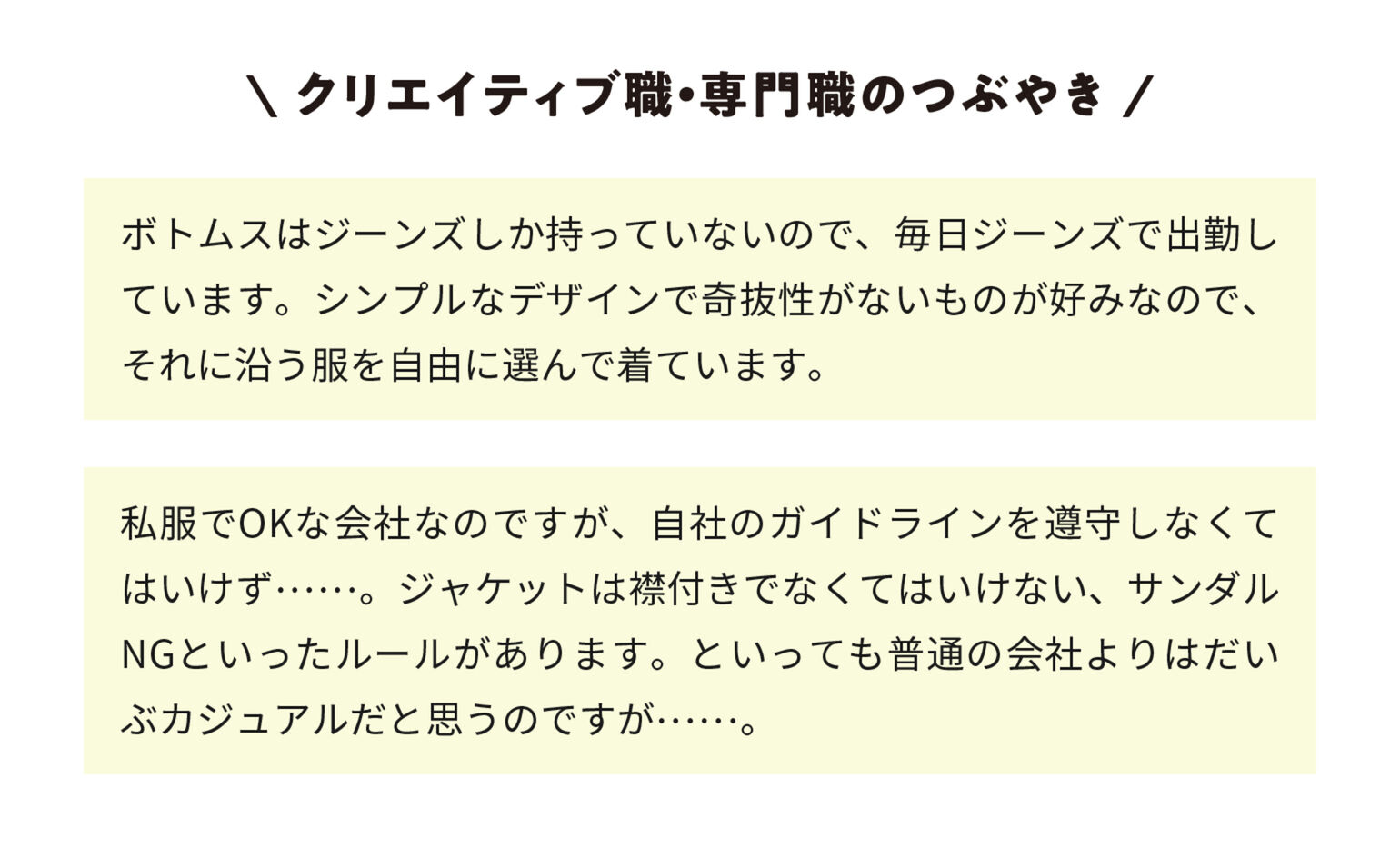 リラックス感のあるスタイルや、個性や好みを表現したスタイルを支持するコメントが目立ち、ビジネスシーンでも自由に服装を選ぶ様子が垣間見えます。