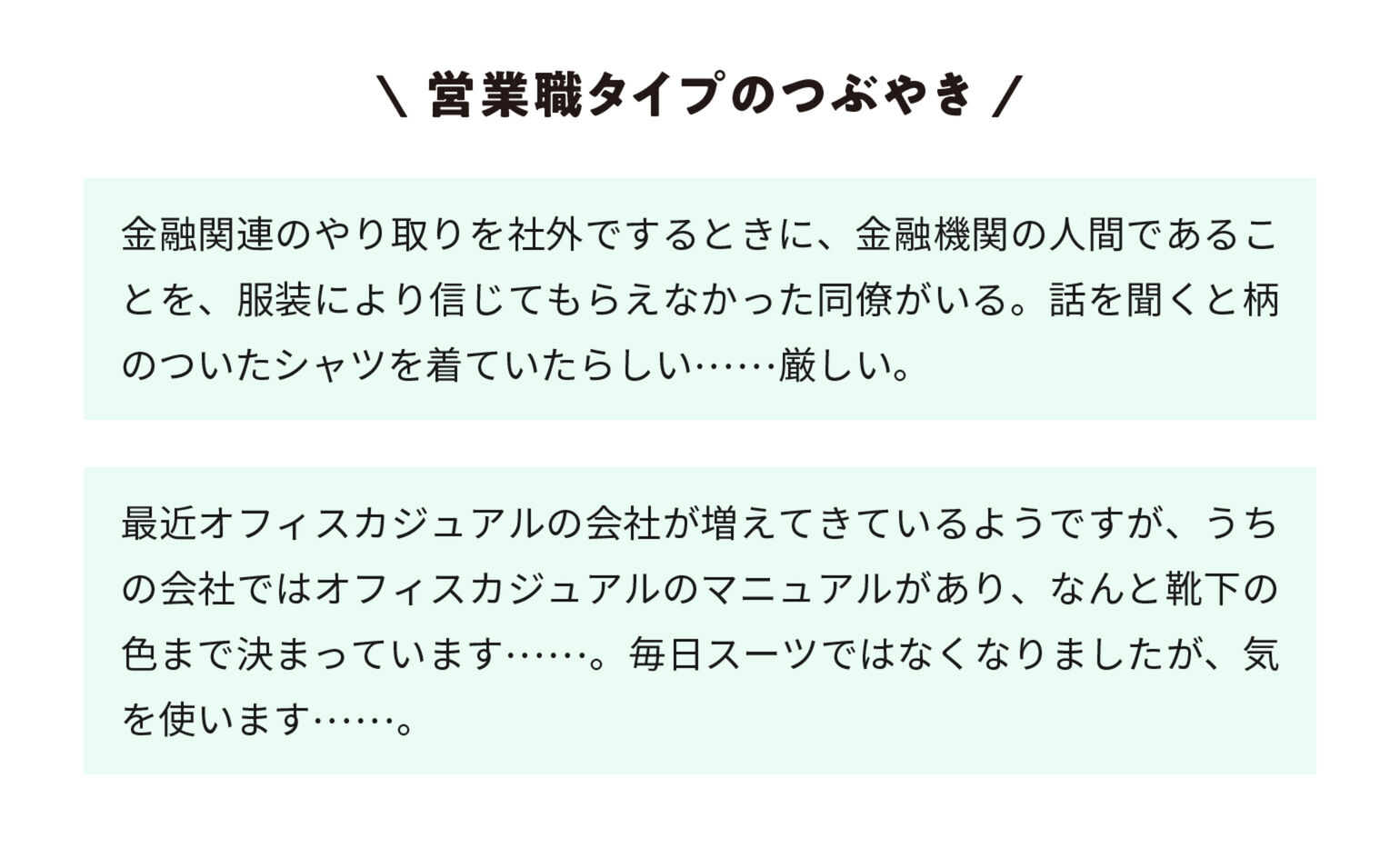このタイプは、ビジネスウェアも私服の延長線上にあると捉えているビジネスパーソンが多い傾向にあるようです。