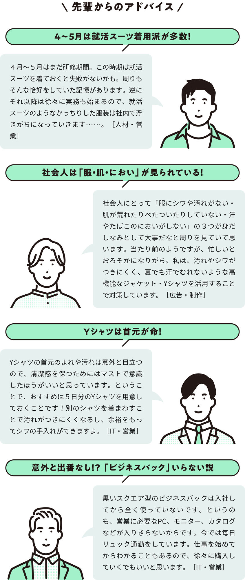 先輩社会人たちに、新社会人のビジネスコーデに対するアドバイスを聞いてみました。