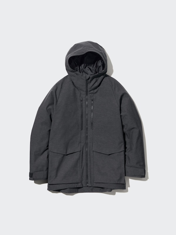[08 DARK GRAY] 表地: 82% ポリエステル, 18% 綿/ 中わた: 前身頃: 後身頃: ウエスト上部分: 90% ダウン, 10% フェザー/ メッシュ部分: 後身頃: ウエスト下部分: 本体脇部分: 袖部分: フード: 70% ポリエステル, 30% レーヨン/ フード縁部分: 100% ポリエステル/ 裏地: 100% ポリエステル/ ポケット布: 100% ポリエステル