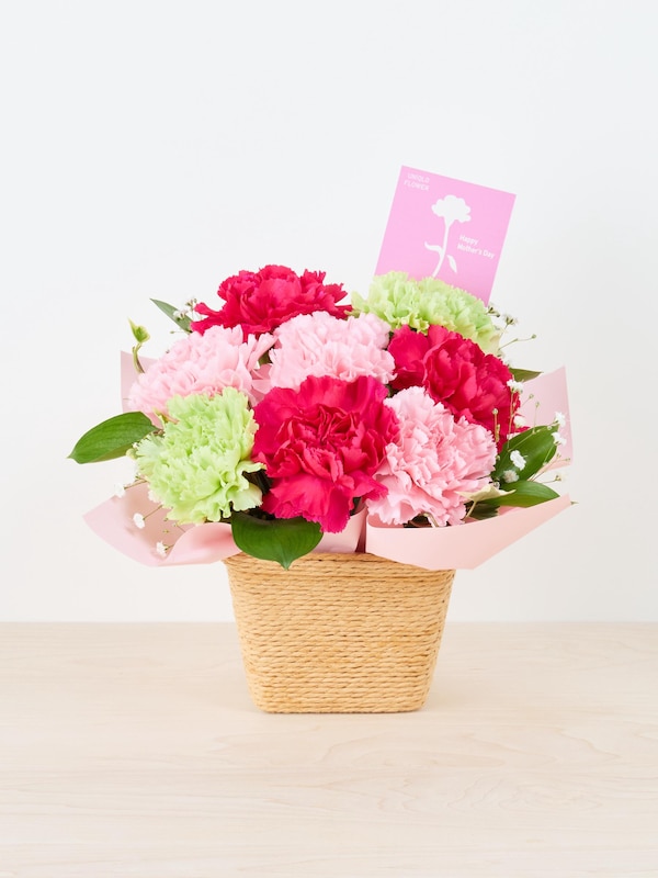 花材:カーネーション、カスミソウ、ルスカス、アイビー