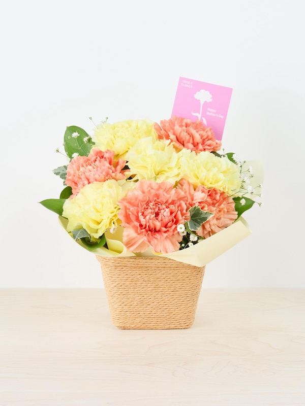 花材:カーネーション、カスミソウ、ルスカス、アイビー