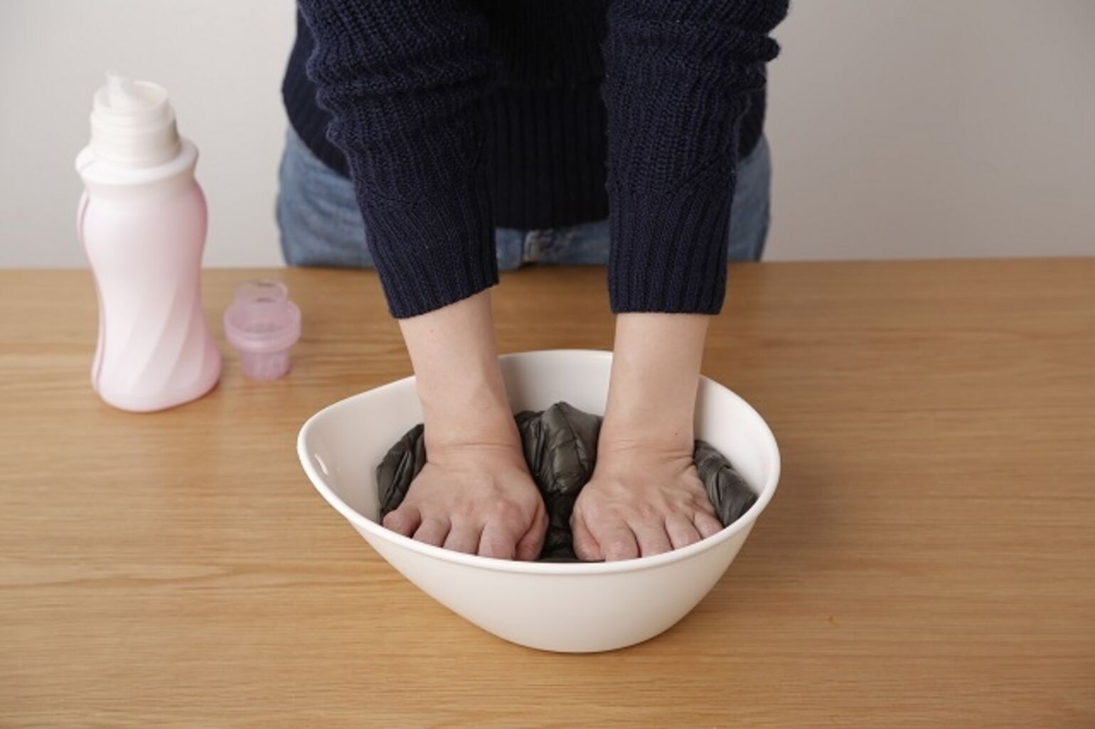 シンクや洗面器にぬるま湯(40℃以下)を張って準備します。中性洗剤を規定量いれたら、よくかき混ぜてください。適当に“これくらい”と入れてしまいがちな洗剤ですが、1着あたりの規定量を守ると余分なすすぎ洗いをせず時間を短縮できます。
