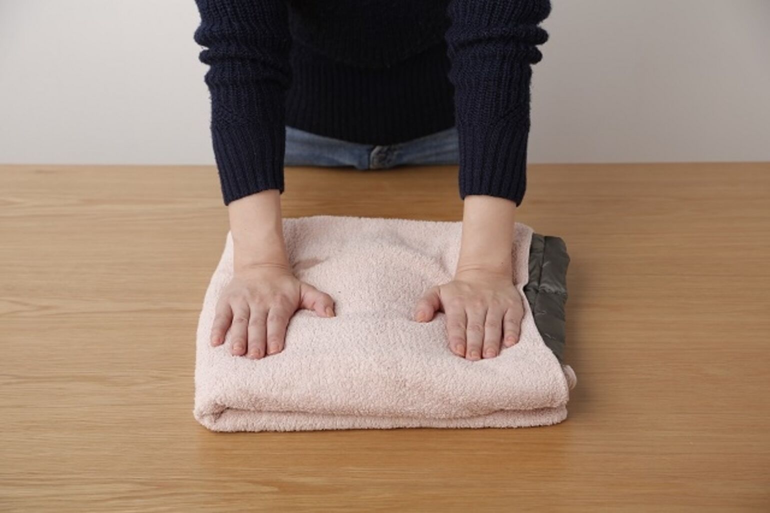 シンクや洗面器の中で上から押して水を切ったら、バスタオルに包んで水分を吸い取ります。身頃や袖を裏返しにして押し出すようにすると、より水を排出しやすくなりますよ。乾燥機は傷みの原因になるので使わないようにしましょう。