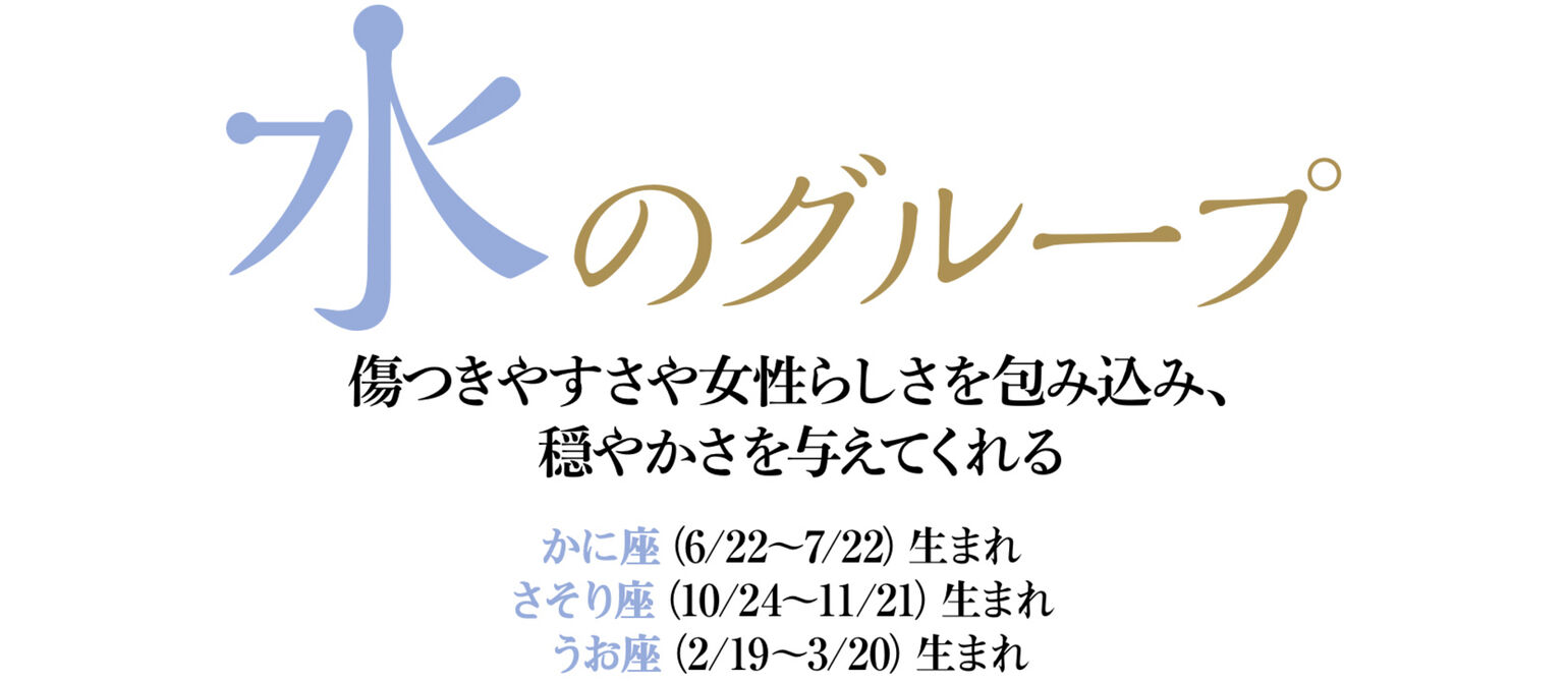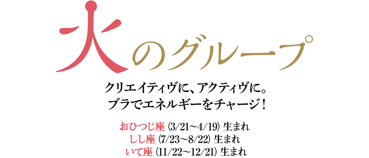 ロマンティックなテイストや華やかさを好むのも水のグループの女性。女性だけの特別なアイテムであるブラジャーやランジェリーにも思い入れがあり、自分のためにはもちろん、パートナーのためにも美しさにこだわります。女らしくありたい、愛されたいという彼女たちの願いを叶えてくれるのは、ワイヤレスブラ ヘザー・ビューティーライトのパープル。身につけるだけで、華やかな気分を約束します。