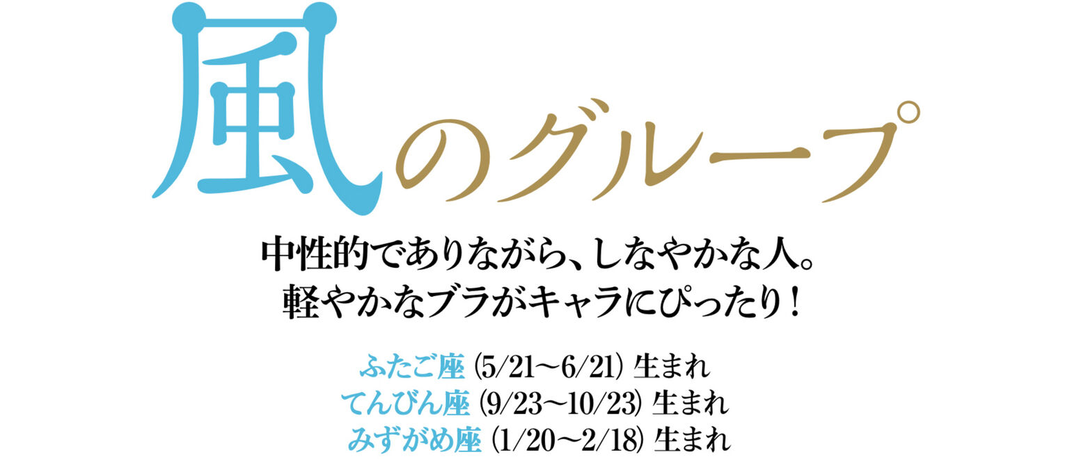 さらさらと通り抜ける風のような爽やかさが信条の風のグループ。「男性星座」でもあり、スマートかつユニセックスでありたいと考えるため、バストはあまり意識したくないタイプです。ワイヤレスブラ ビューティーライトのライトブルーなら、つけていることも、女性であることも忘れるほどの身軽さ、軽やかさ。自由でしなやかな、自立した女性というセルフイメージにもぴったりの一枚です。