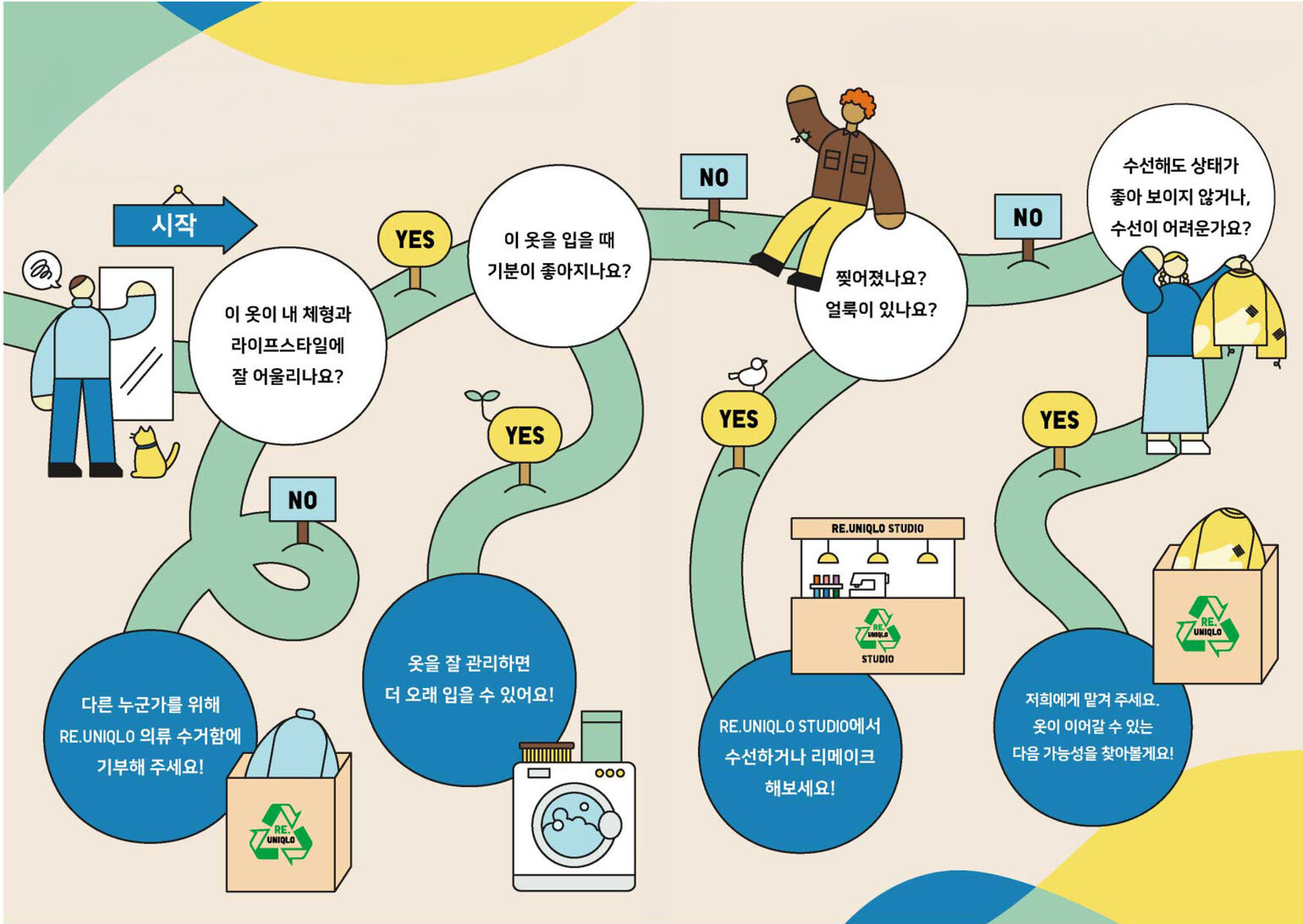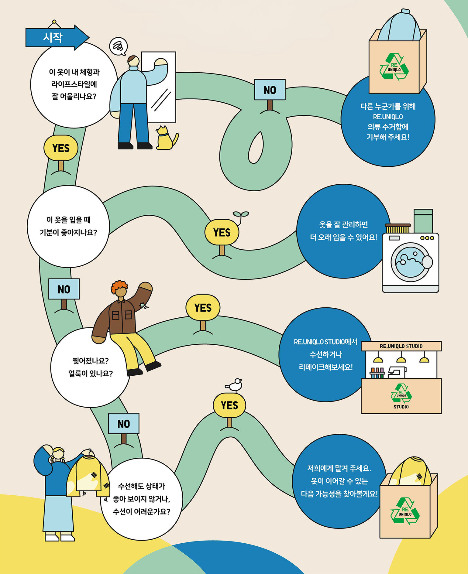 유니클로는 옷의 모든 순간을 함께하기 위해, 옷장 속 한 벌 한 벌을 어떻게 이어갈지 안내하는 간단한 가이드를 준비했습니다. 가치 있는 옷이 헛되이 버려지지 않도록요.