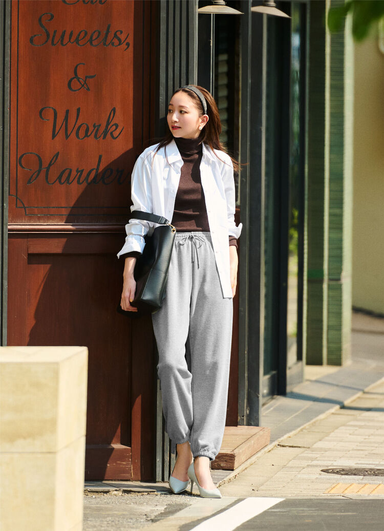 Sweat pants are surely an all-time classic where they can be worn in every seasons. The jogger silhouette can be paired with anything from pumps to sneakers. It's easy to take advantage of the casual feel of sweat pants and put together other elegant items. Tuck in a slim ribbed turtleneck sweater and wear a white shirt loosely for a relaxed look. Finish off your look with matching pumps connected to your pants to lengthen your legs.