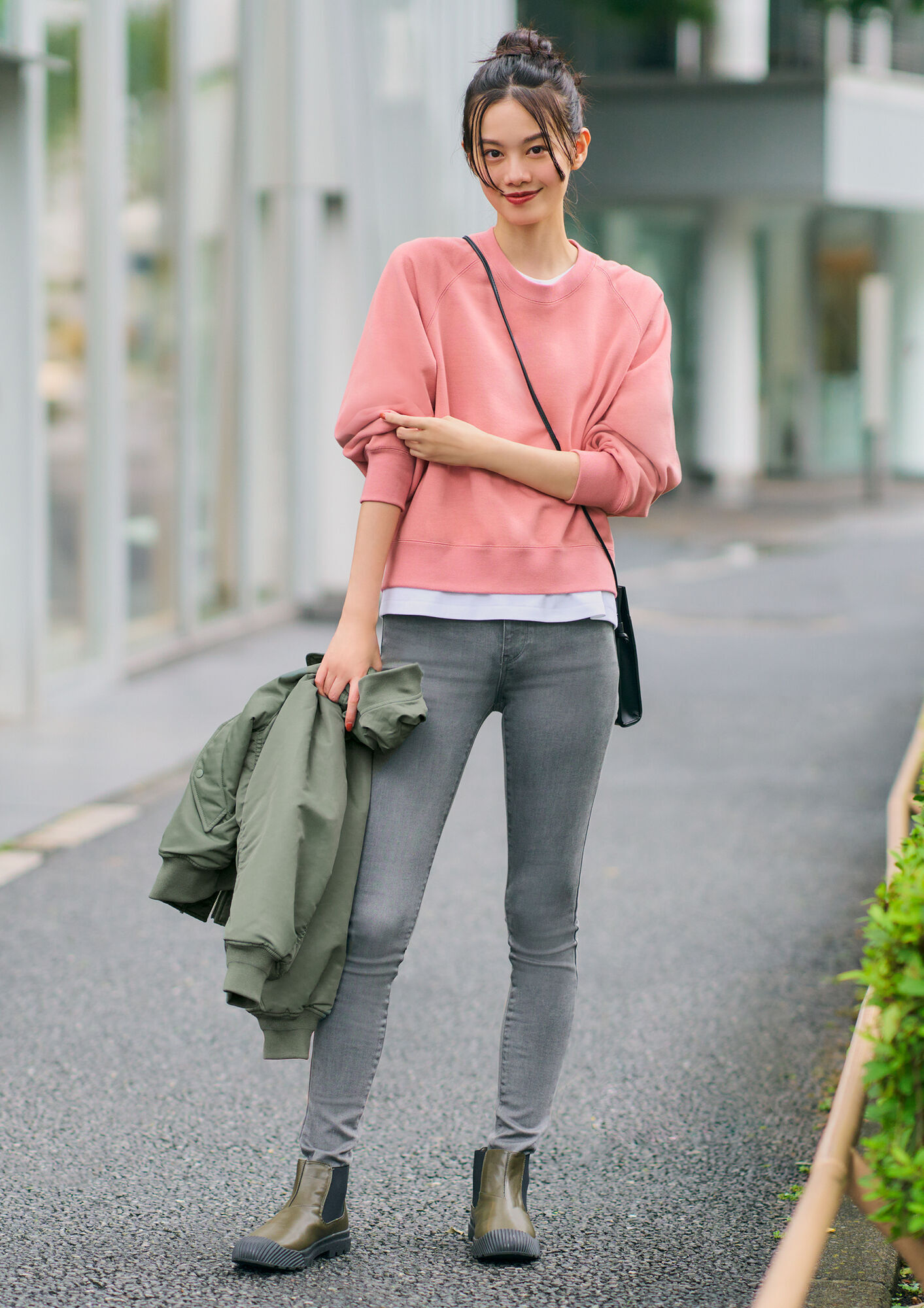 The popular sweatshirt has been updated with a fluffy fleece material. It also features a modern design with a relaxed silhouette as well as length that is just right. Rolling up the ribbed sleeves makes it look cute and goes well with skinny jeans. You may also consider showing off the white T-shirt from the hem and neck for a more mature look.