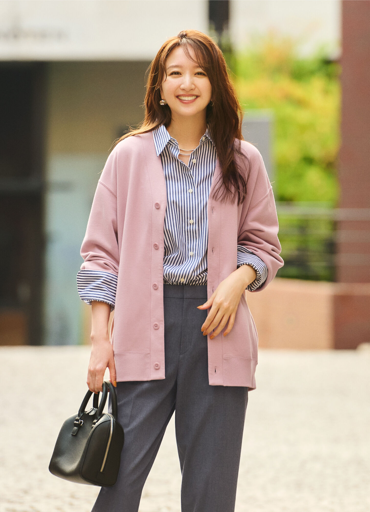 When we think of cardigans, we tend to think of bulky and thick knits, which is why this cardigan stands out from the rest as the material is not as ‘heavy’ as your usual knit. This item is also genderless, which makes it perfect to be worn by all genders. For this outfit, opt for a combination of striped shirt and smart ankle pants to create a structured look, while pairing it with the sweat cardigan for a moderately casual feel that is not too conservative, creating a healthy balance that is approachable. The playfulness of choosing “pink” is also a key point that makes you look relaxed and mature.