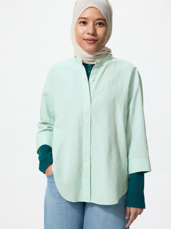 Linen Blend Band Collar Shirt | 3/4 Sleeve