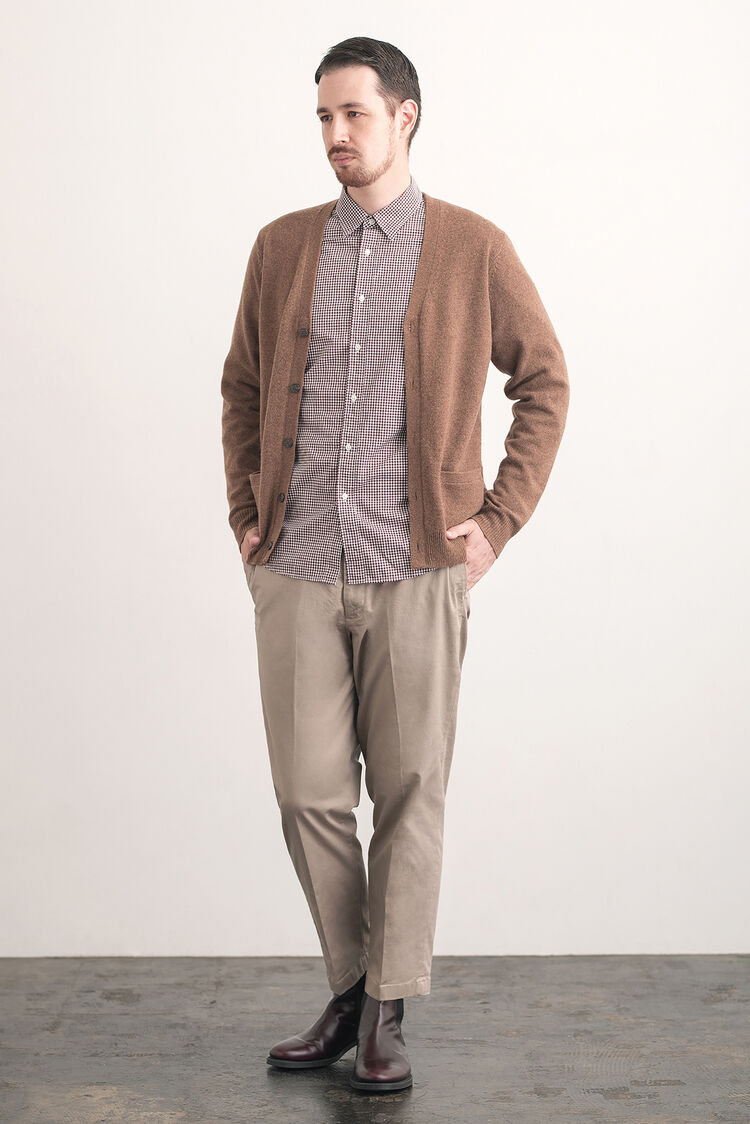 He wears: Extra Fine Cotton shirt, lambswool cardigan, EZY ankle pants, socks