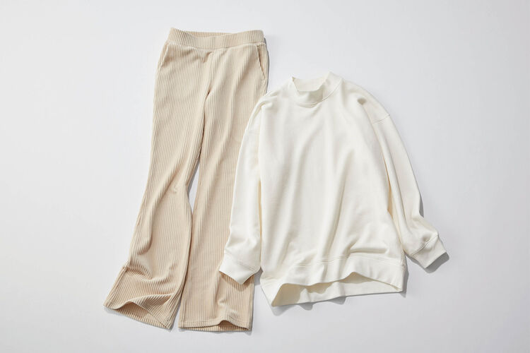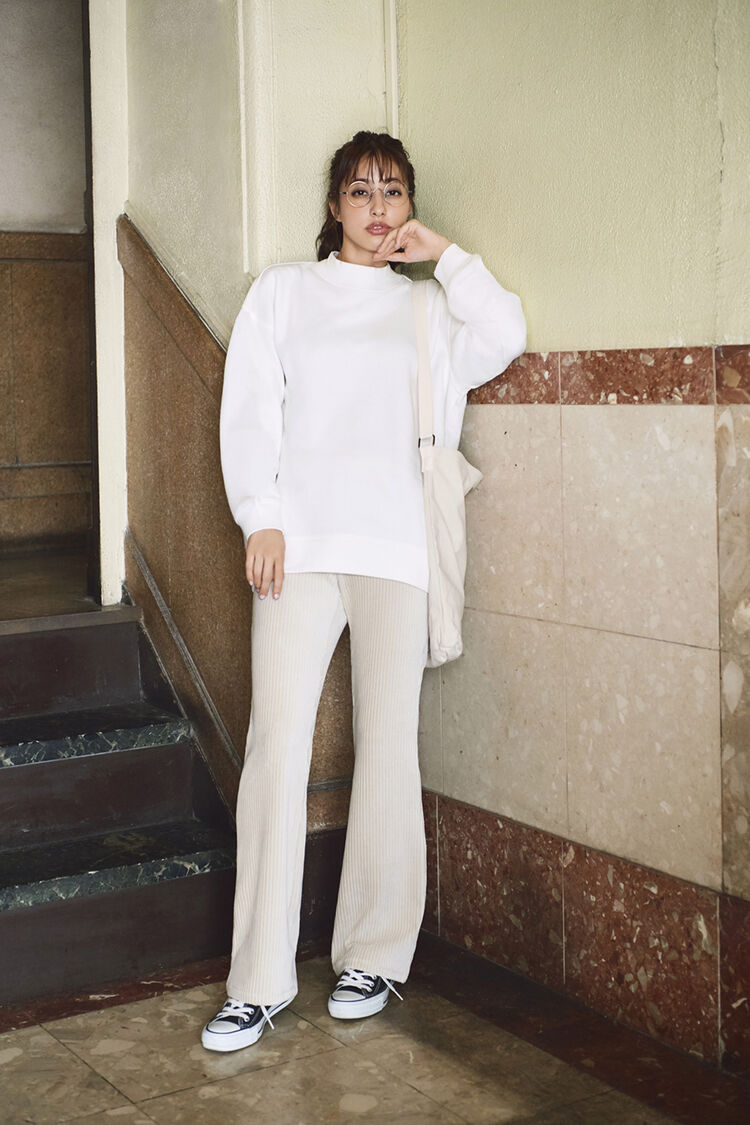 Made around a bottleneck sweat top and corduroy flared pants, this stylish all-white coordinate is packed with trendy touches. An all-white coordinate gains depth when varying shades and different fabrics are combined. Stick to breezy peripherals as well, such as sneakers and a canvas bag.