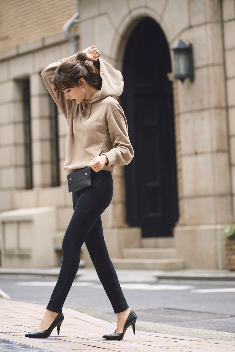 Even a classic hoodie and skinny pants look becomes much more stylish when beige is added to the mix. The combination of chic light beige and sharp black adds a classy feel to this sporty outfit. This oversized hoodie and its large hood offer the bonus benefit of producing an upper half that appears more delicate.